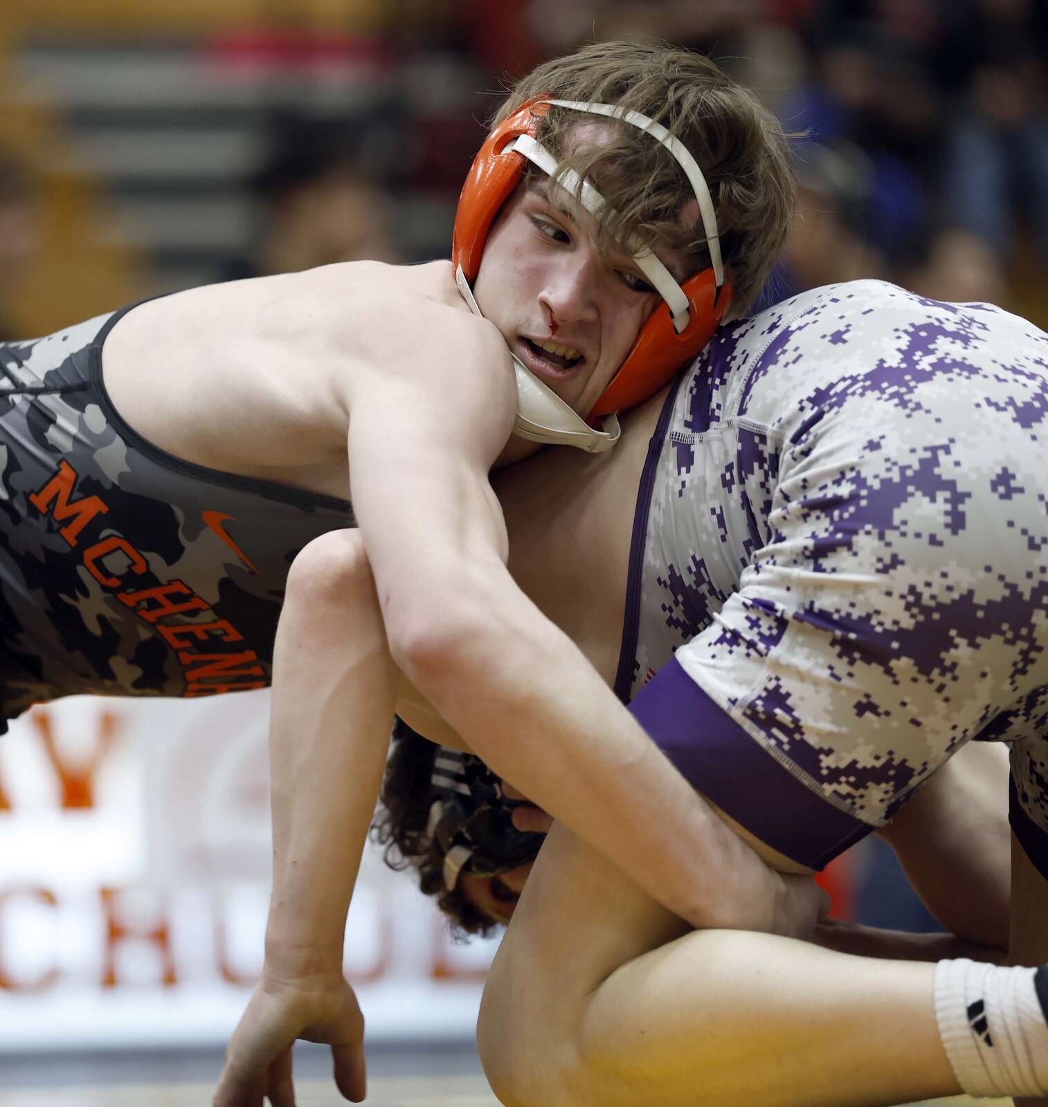Alex Hengles of Downers Grove North wrestles Ryan Johnston of McHenry at 144-pounds during the Clint Arlis Invitational boys wrestling invite Saturday, Jan. 17, 2026 in Batavia. Brian Hill/bhill@dailyherald.com