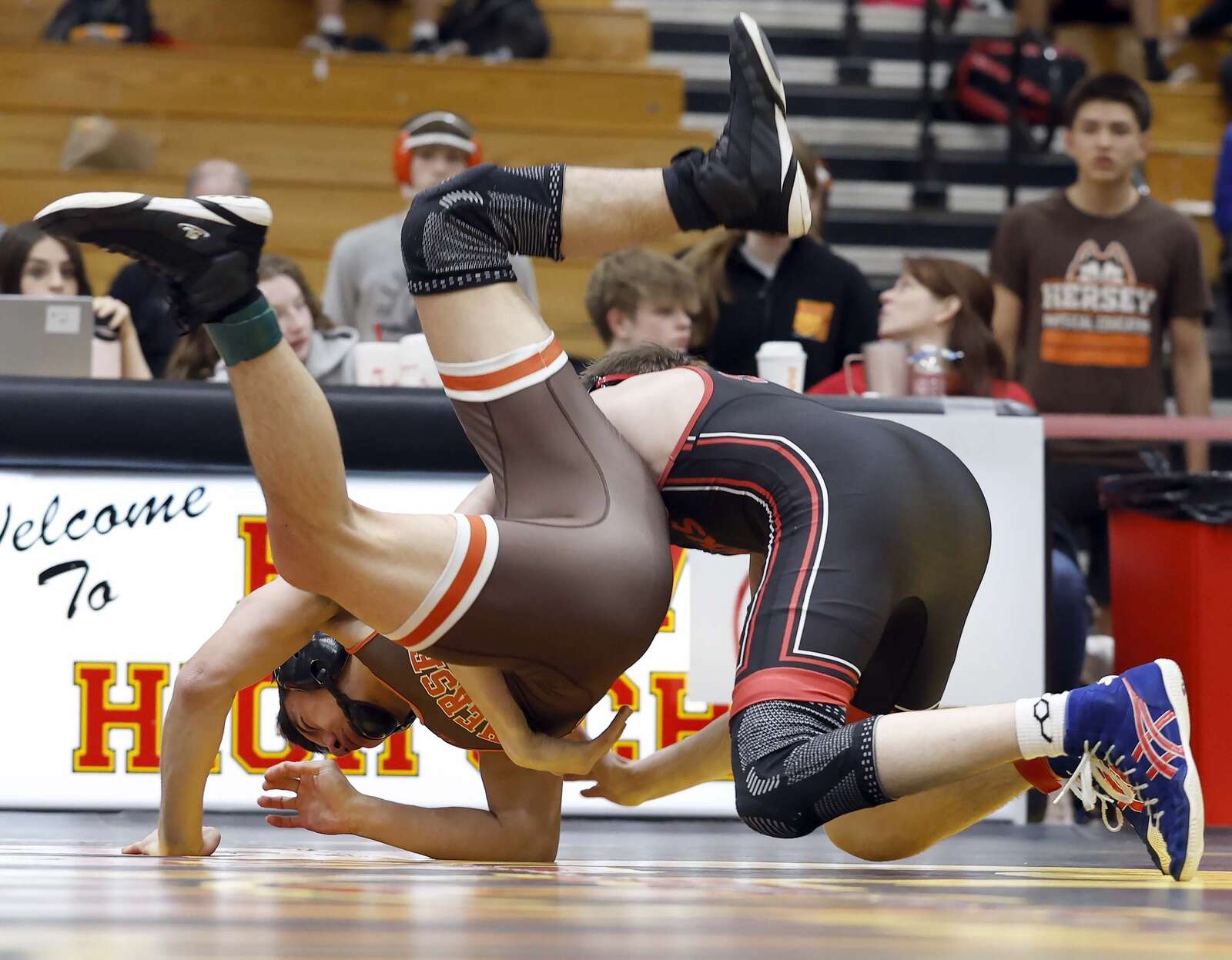 Jake Colleran of Maine South wrestles Nolan Variano of Hersey at 144-pounds during the Clint Arlis Invitational boys wrestling invite Saturday, Jan. 17, 2026 in Batavia. Brian Hill/bhill@dailyherald.com