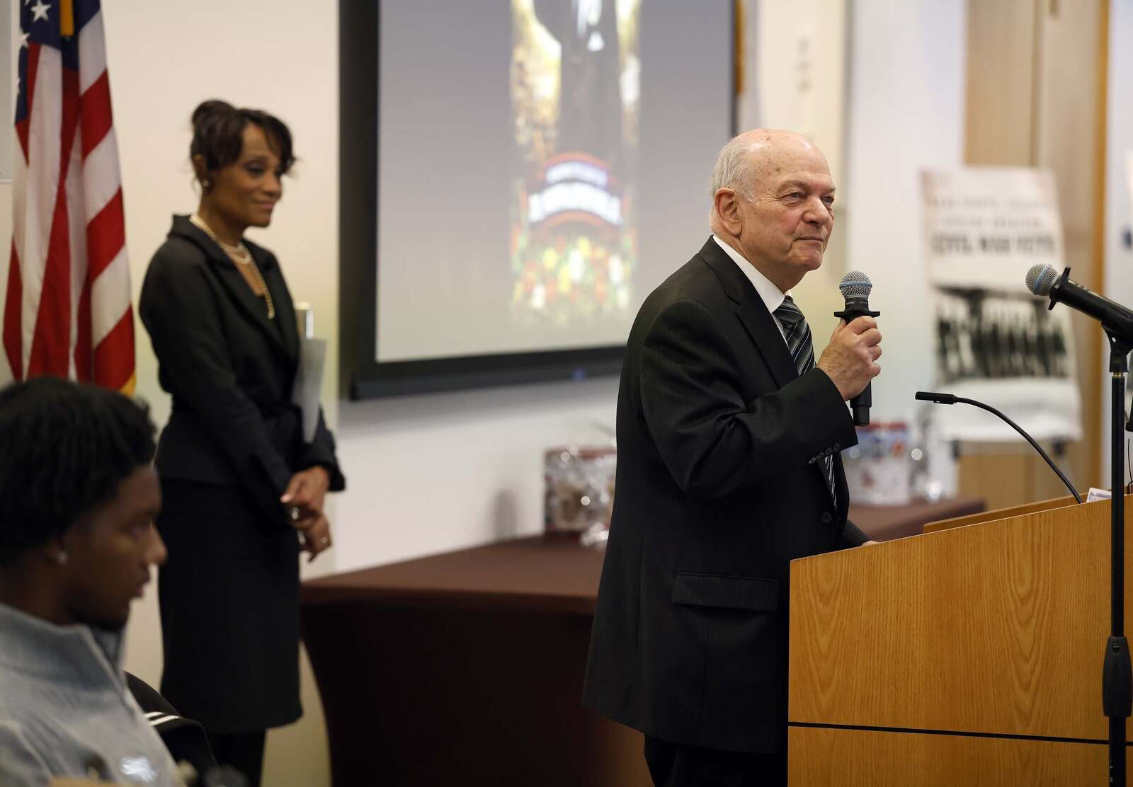 Elgin Mayor Dave Kaptain delivers the proclamation during the 41st annual Dr. Martin Luther King Jr. Prayer Breakfast Saturday at Elgin Community College in Elgin. Mistress of Ceremonies Lisa Jackson from Elgin Area School District U-46 is at left.