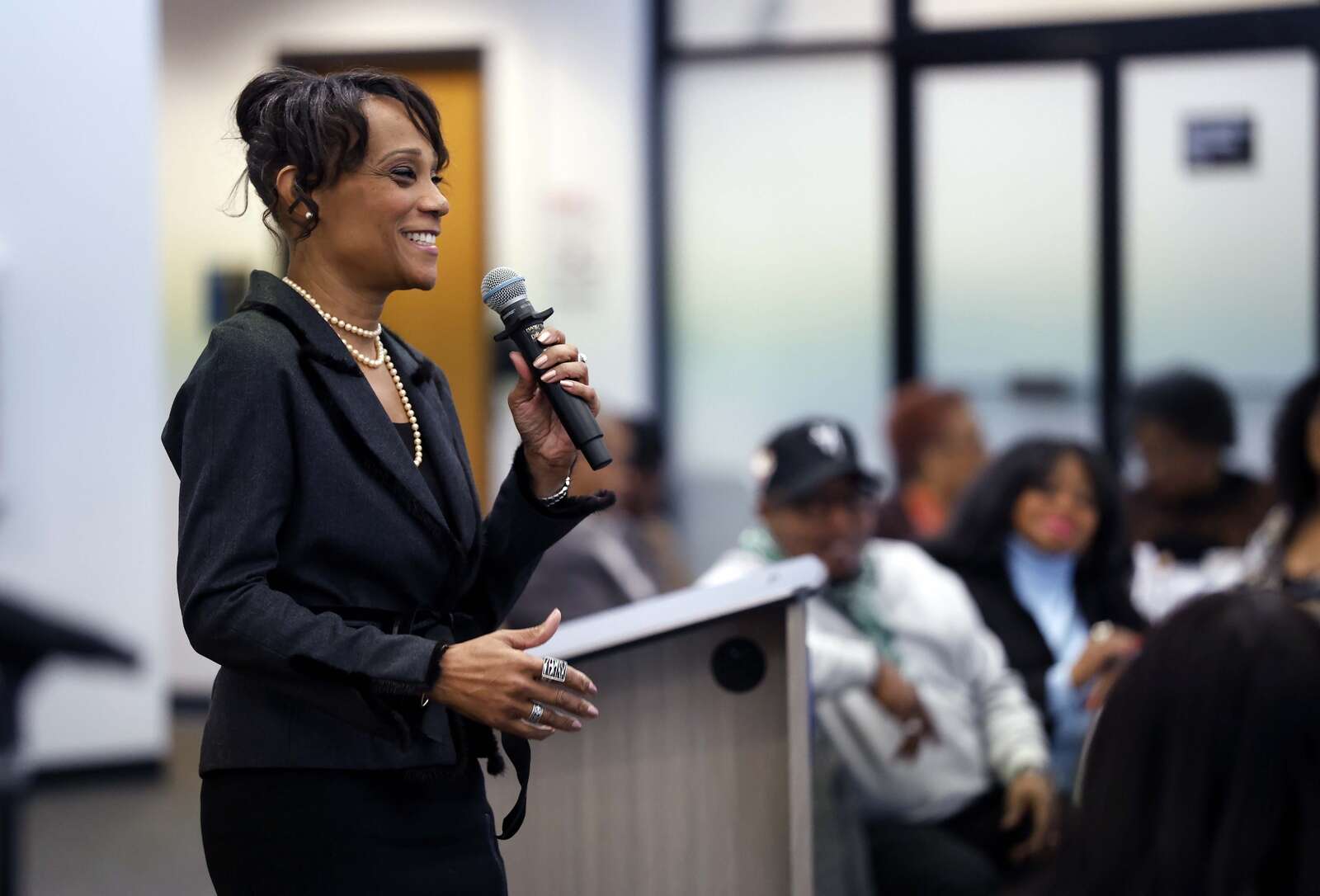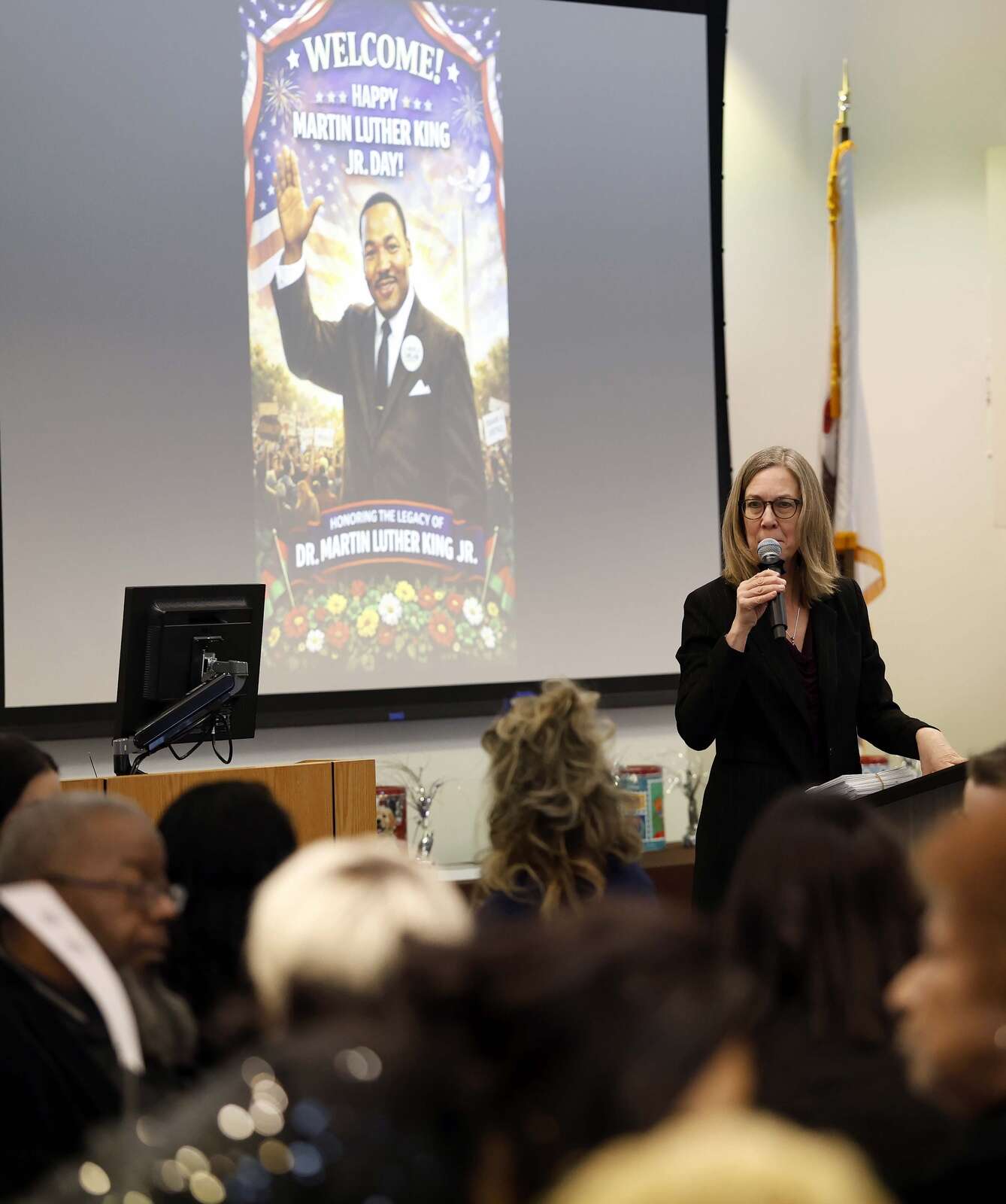 Elgin Community College President Dr. Peggy Heinrich addresses the crowd during the 41st Annual Dr. Martin Luther King Jr. Prayer Breakfast Saturday at the college.