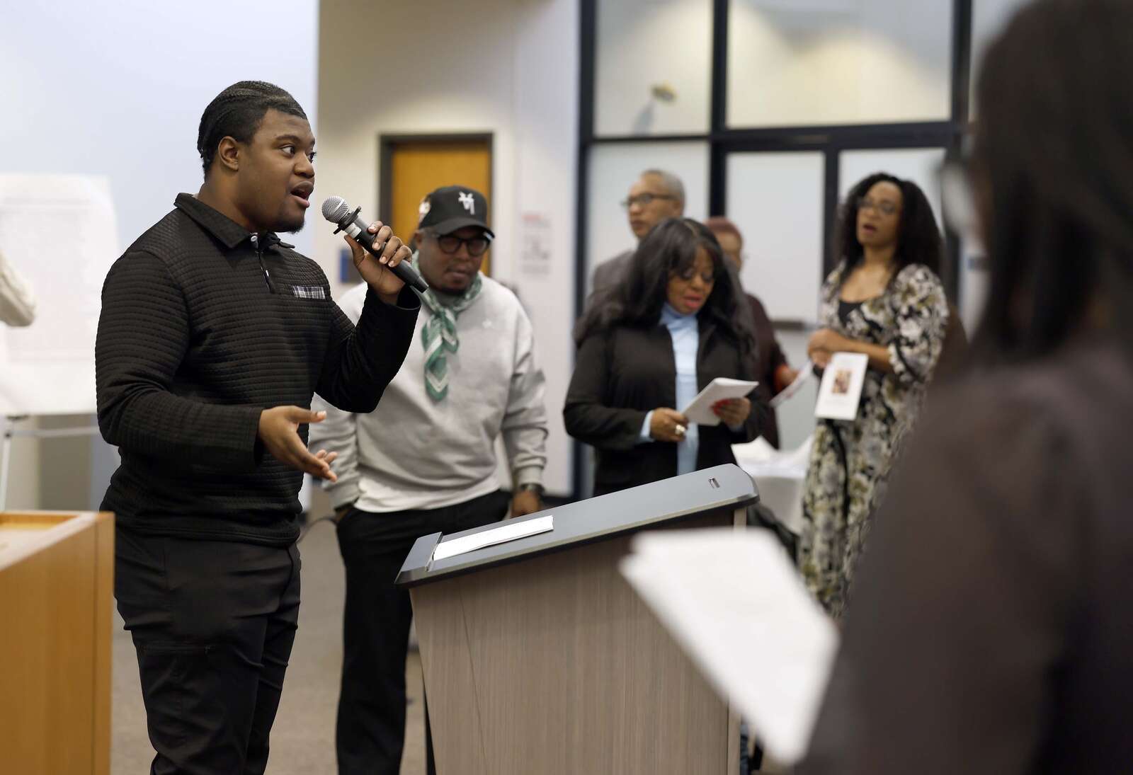 Laron Matthews Jr. leads a group singing “Lift Every Voice and Sing” during the 41st Annual Dr. Martin Luther King Jr. Prayer Breakfast Saturday at Elgin Community College’s Spartan Drive campus.
