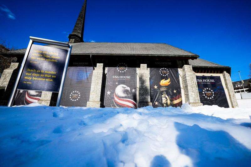 Posters cover the church hosting the United States House on the eve of the start of the annual meeting of the World Economy Forum in Davos, Switzerland, Sunday. AP