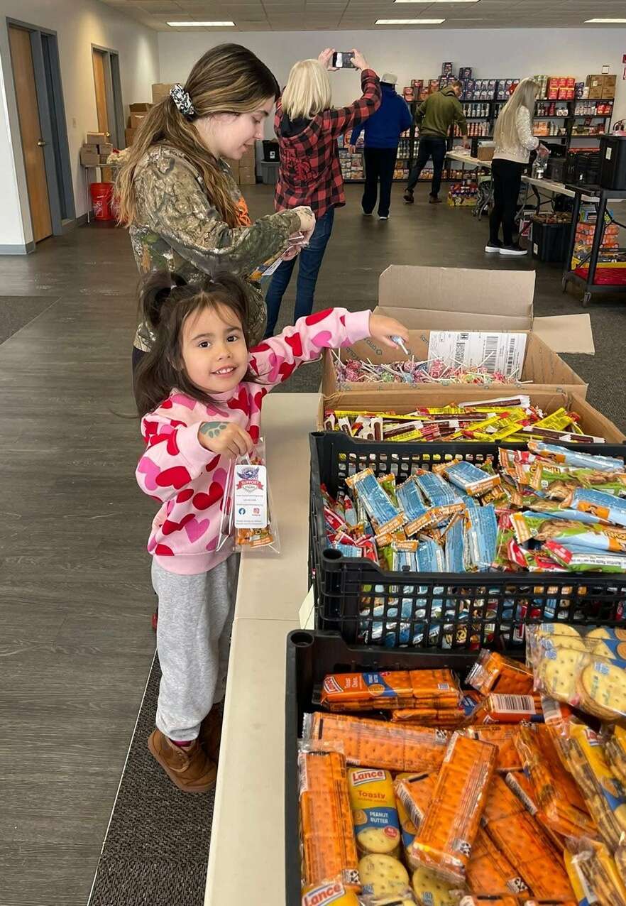 One of the youngest volunteers helps put together a snack pack for first responders with sandwich crackers, granola bars, meat sticks, lollipops, and more. Courtesy of Support Over Stigma