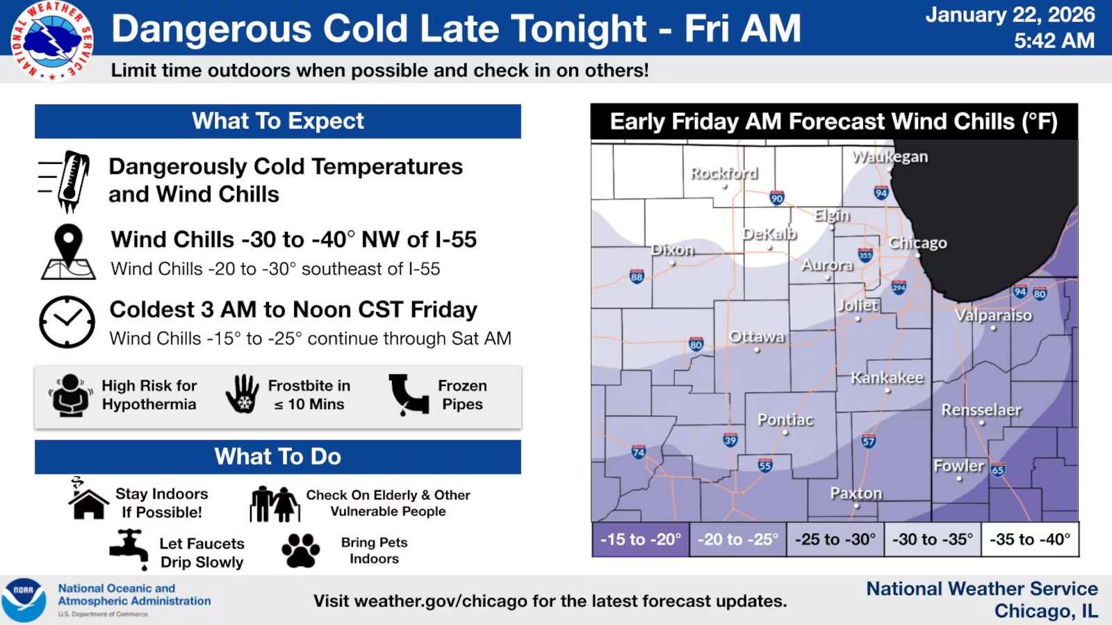 The last such warning for the Chicago area was in 2022. Meteorologists are considering issuing a cold weather advisory for the area once the warning expires Saturday, Yack added.