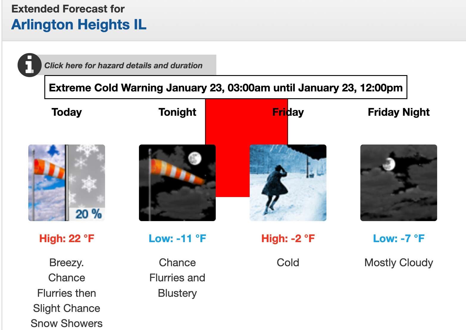 An Extreme Cold Warning is in effect from 3 a.m. Friday until noon for Cook and the collar counties. The warning extends throughout the entirety of Northern Illinois and as far south as Bloomington, but also covers all of Wisconsin, Minnesota and North Dakota as well as most of Iowa and parts of Indiana, Montana, Nebraska, South Dakota and much of Michigan's Upper Peninsula.