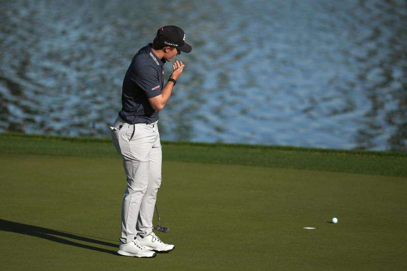 Blades Brown reacts to missing a birdie putt at the ninth hole, his final hole, scoring a 12-under-par 60 during the second round of the American Express golf event at the Jack Nicklaus Tournament Course at PGA West Friday, Jan. 23, 2026, in La Quinta, Calif. (AP Photo/Ross D. Franklin) (AP Photo/Ross D. Franklin)