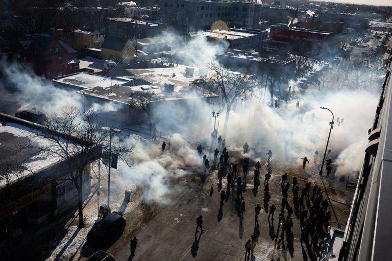 Federal agents deploy tear gas and other munitions into a crowd of people near the intersection of 27th Street and Nicollet Avenue in Minneapolis after a federal officer shot and killed 37-year-old Alex Pretti on Saturday, Jan. 24, 2026. (Ben Hovland/Minnesota Public Radio via AP) (Ben Hovland/Minnesota Public Radio via AP)