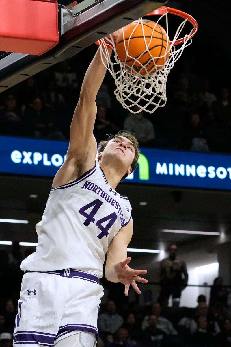 Northwestern guard Angelo Ciaravino dunks during the second half of an NCAA college basketball game against Penn State in Evanston, Ill., Thursday, Jan. 29, 2026. (AP Photo/Nam Y. Huh) (AP Photo/Nam Y. Huh)
