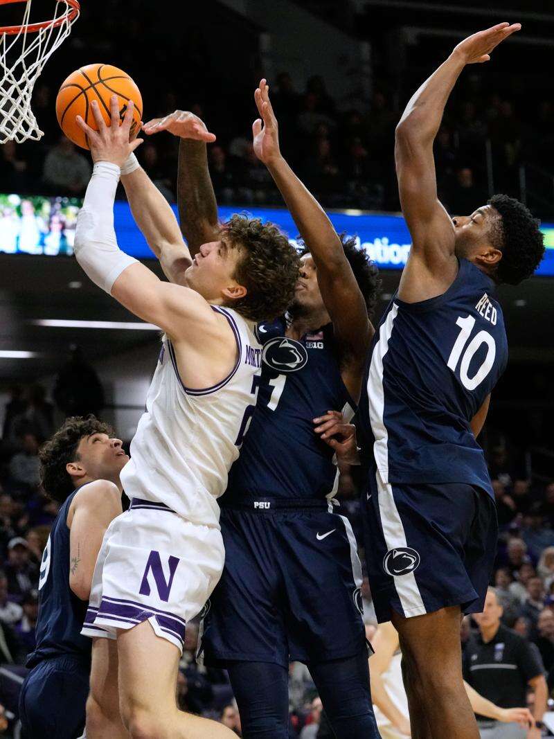 Northwestern forward Nick Martinelli, second from left, drives to the basket past Penn State forward Mason Blackwood, second from right, and forward Josh Reed (10) as Penn State guard Melih Tunca, left, watches during the second half of an NCAA college basketball game in Evanston, Ill., Thursday, Jan. 29, 2026. (AP Photo/Nam Y. Huh) (AP Photo/Nam Y. Huh)