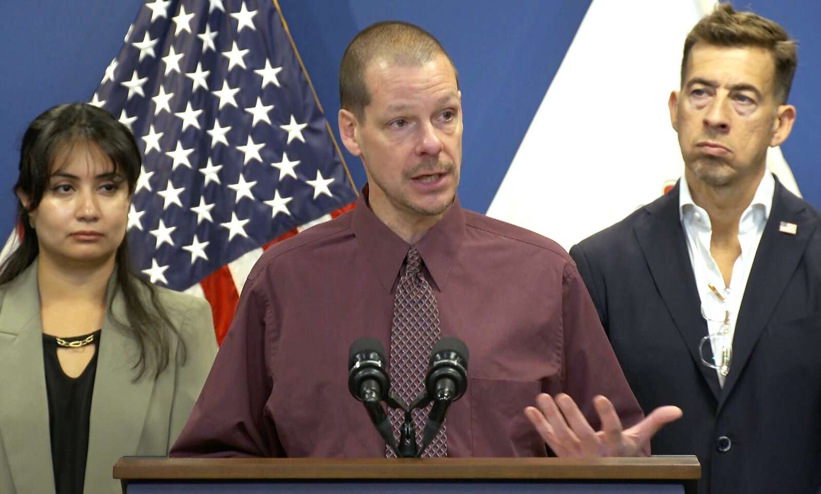 Ride Illinois Executive Director Dave Simmons of Elk Grove Village speaks at a press conference Thursday on statewide efforts to improve the safe use of e-bikes and similar vehicles as State Rep. Barbara Hernandez of Aurora and Secretary of State Alexi Giannoulias look on. Courtesy of Illinois.Gov
