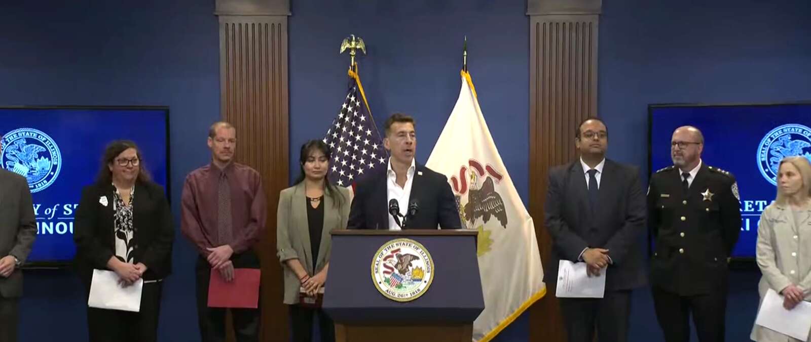 Illinois Secretary of State Alexi Giannoulias is flanked by experts from a variety of fields at a press conference Thursday on proposed new statewide measures to enhance the safe use of e-bikes and other micromobility devices. Courtesy of Illinois.Gov