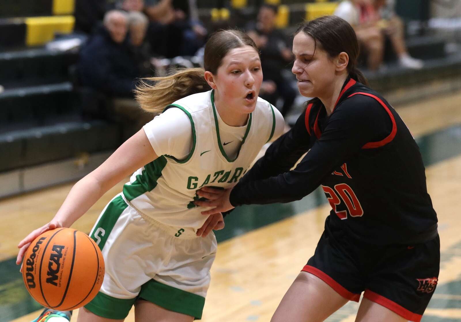 Crystal Lake South's Ellie Starnes tries to drive the baseline against Huntley's Alyssa Borzych during a Fox Valley Conference girls basketball game on Friday, Jan. 30, 2026, at Crystal Lake South High School. Gregory Shaver — Shaw Media