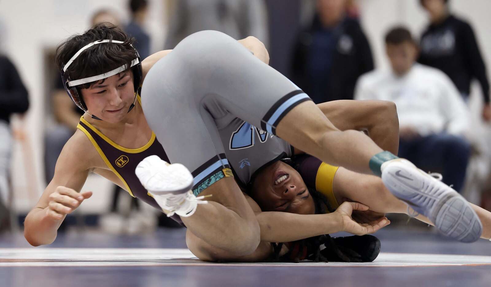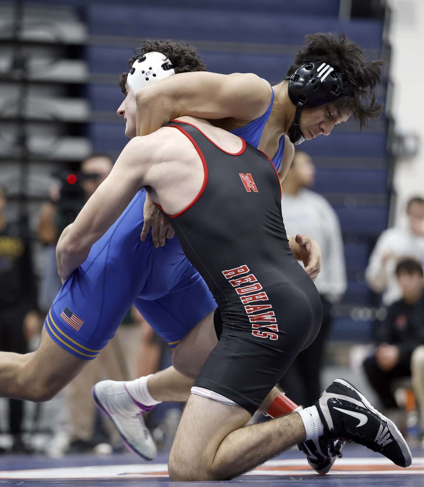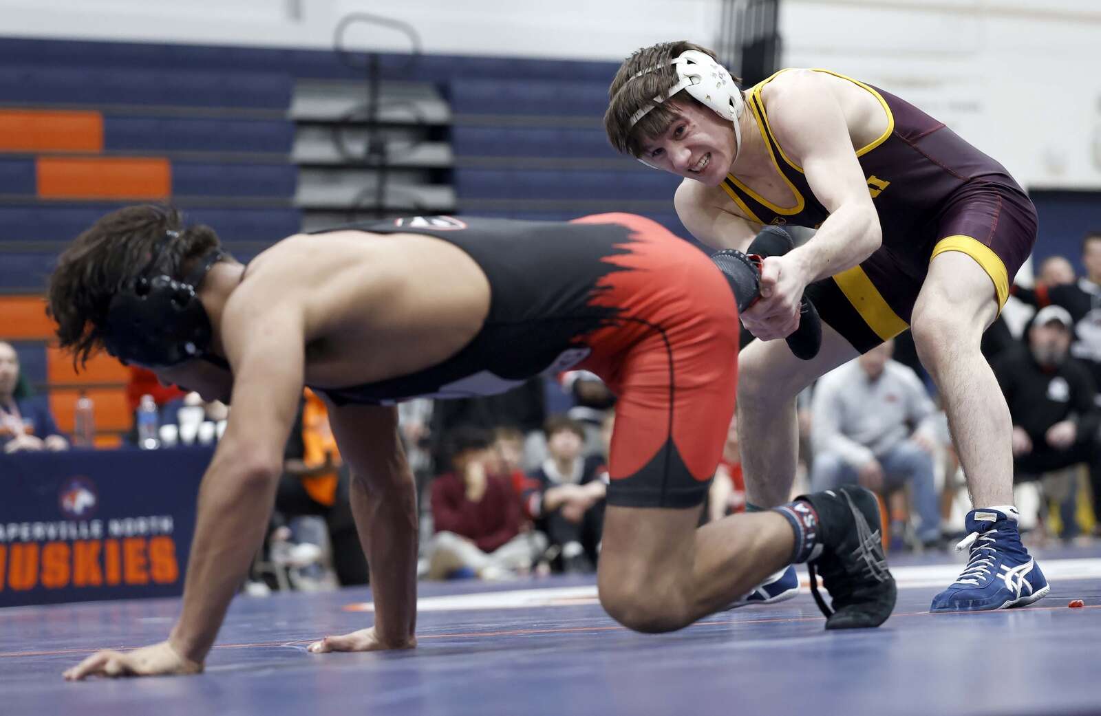 Timothy Garmon of Naperville North wrestles Reid Balis of Naperville Central at 157-pounds during the IHSA Class 3A Boys Regional Wrestling Tournament Saturday, Jan. 31, 2026 in Naperville at Naperville North High School. Brian Hill/bhill@dailyherald.com