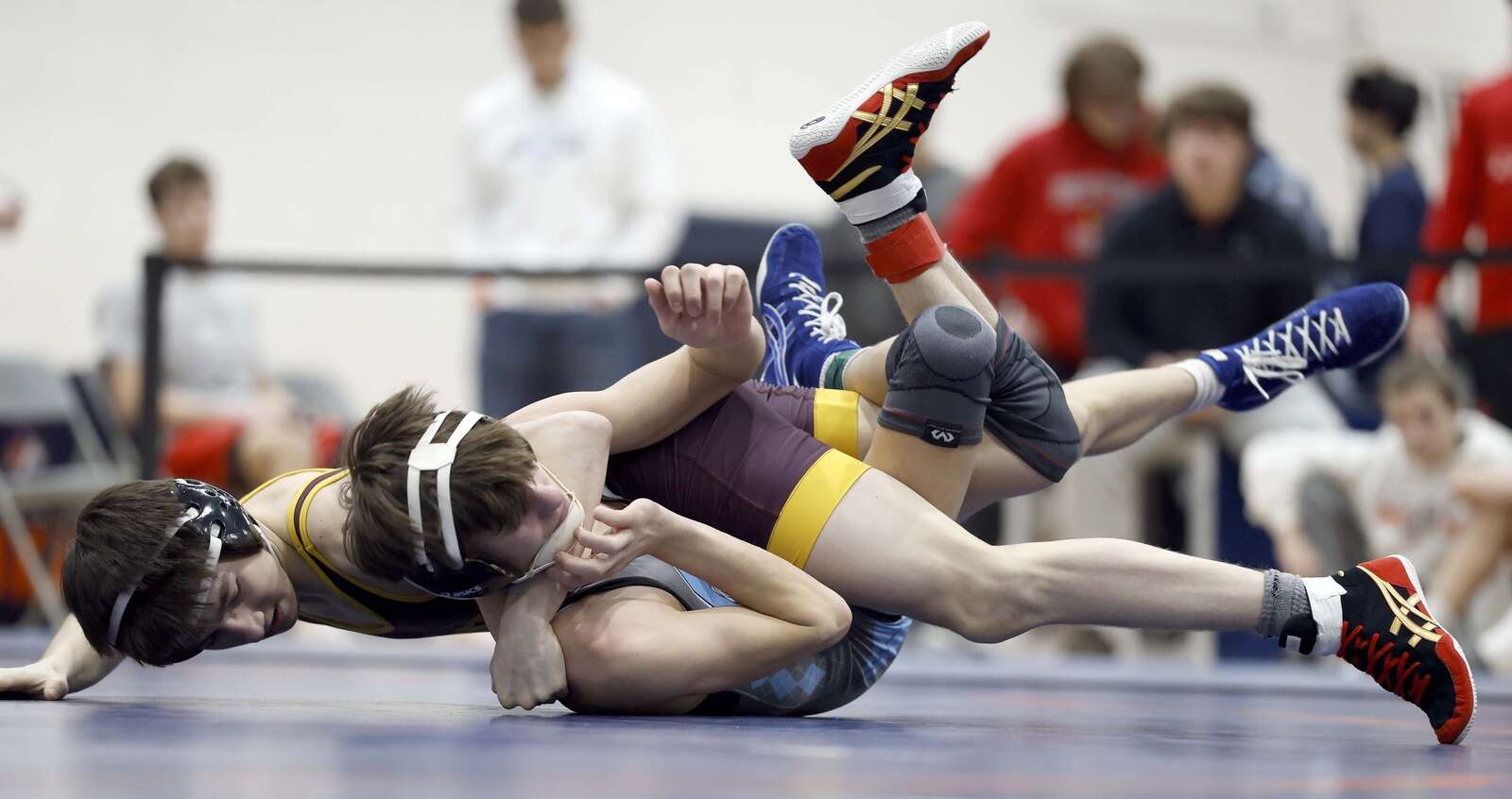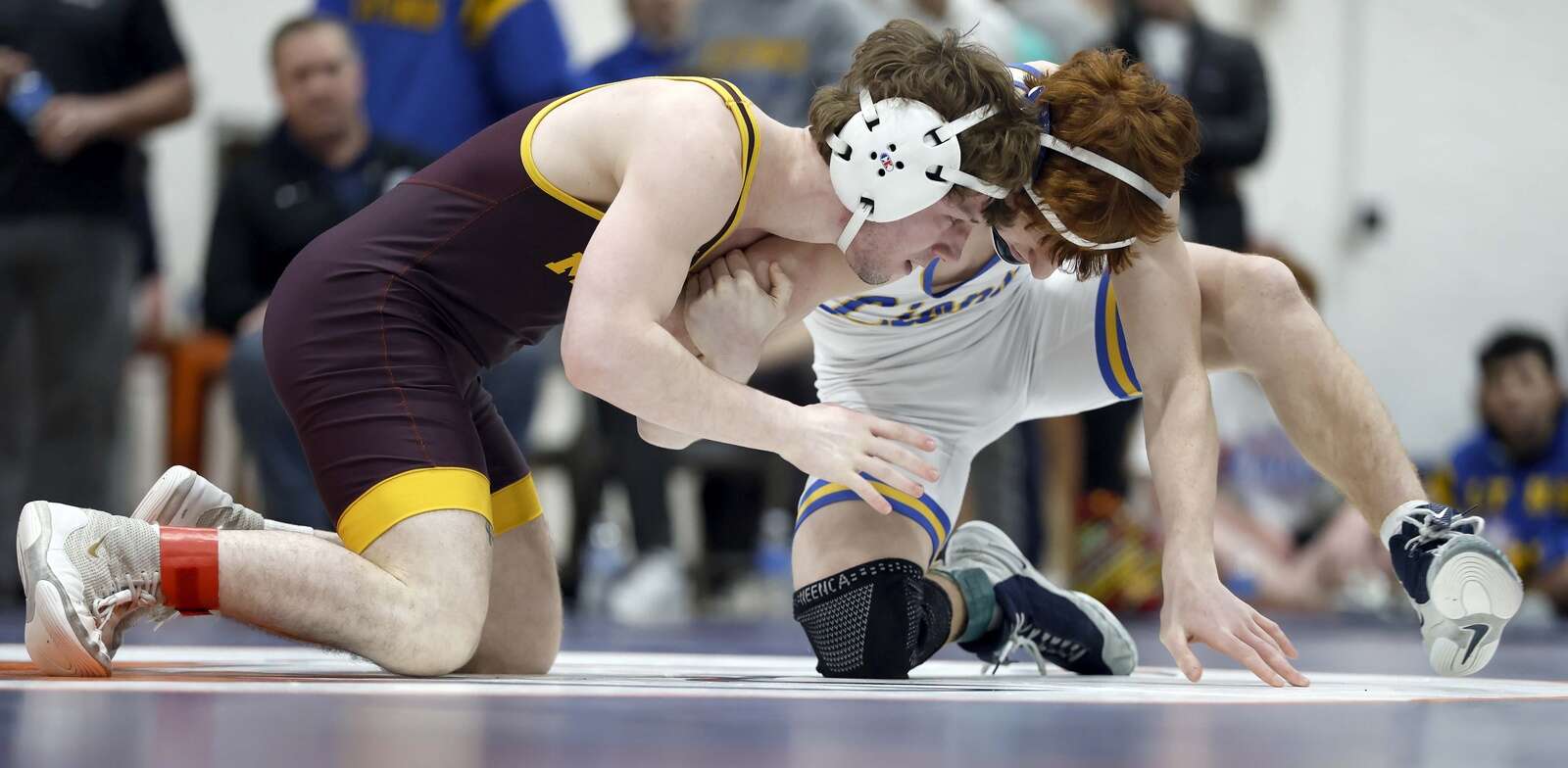 Jeremy Huf of Montini wrestles Griff Powell of Lyons at 138-pounds during the IHSA Class 3A Boys Regional Wrestling Tournament Saturday, Jan. 31, 2026 in Naperville at Naperville North High School. Brian Hill/bhill@dailyherald.com