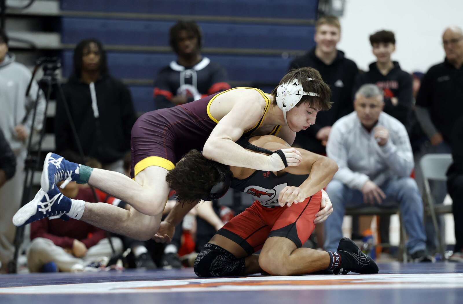Vince Bern of Naperville Central wrestles Jesse Nunez-Garcia of Lyons at 150-pounds during the IHSA Class 3A Boys Regional Wrestling Tournament Saturday, Jan. 31, 2026 in Naperville at Naperville North High School. Brian Hill/bhill@dailyherald.com