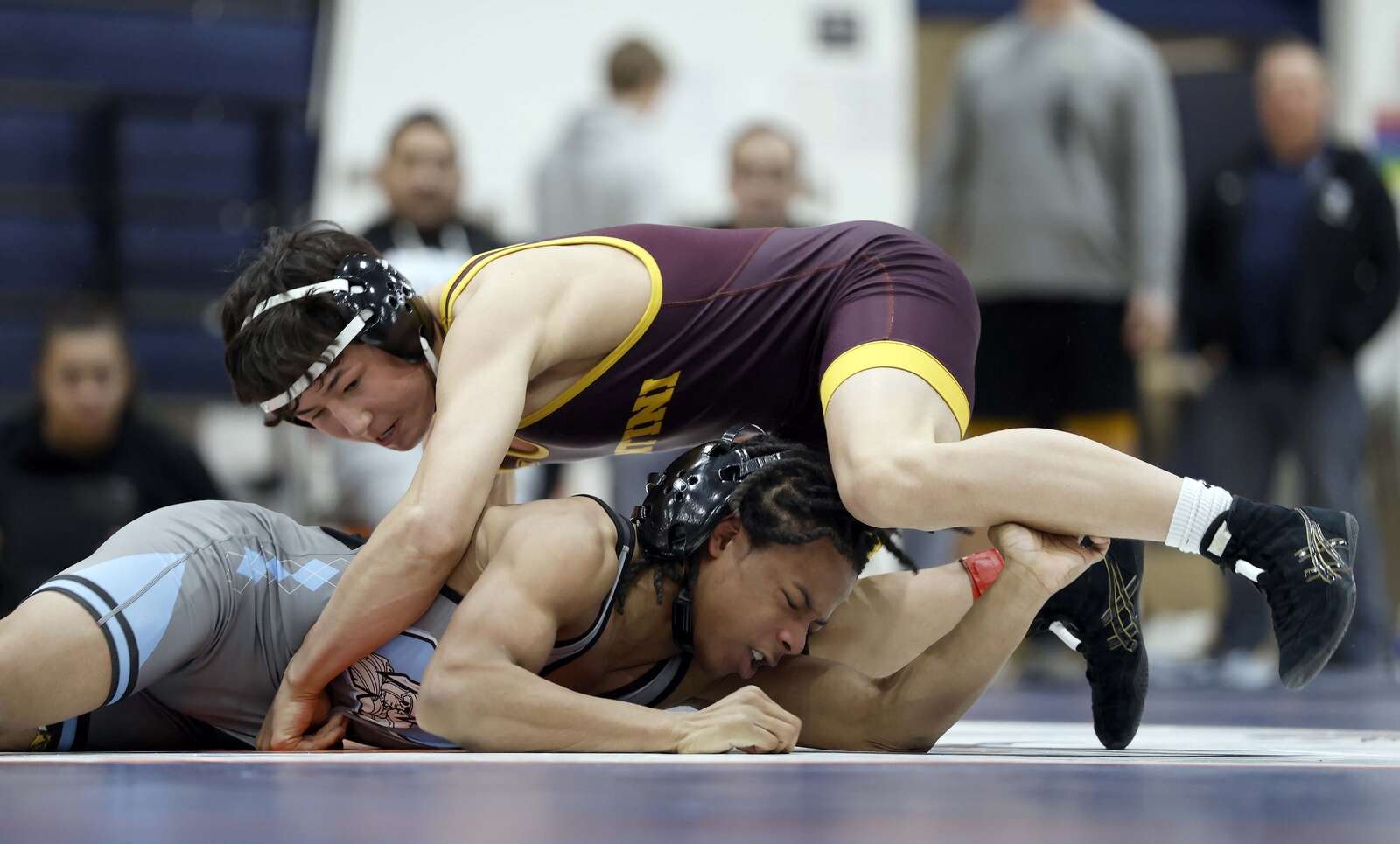 Allen Woo of Montini wrestles Aris Neal of Willowbrook at 120-pounds during the IHSA Class 3A Boys Regional Wrestling Tournament Saturday, Jan. 31, 2026 in Naperville at Naperville North High School. Brian Hill/bhill@dailyherald.com