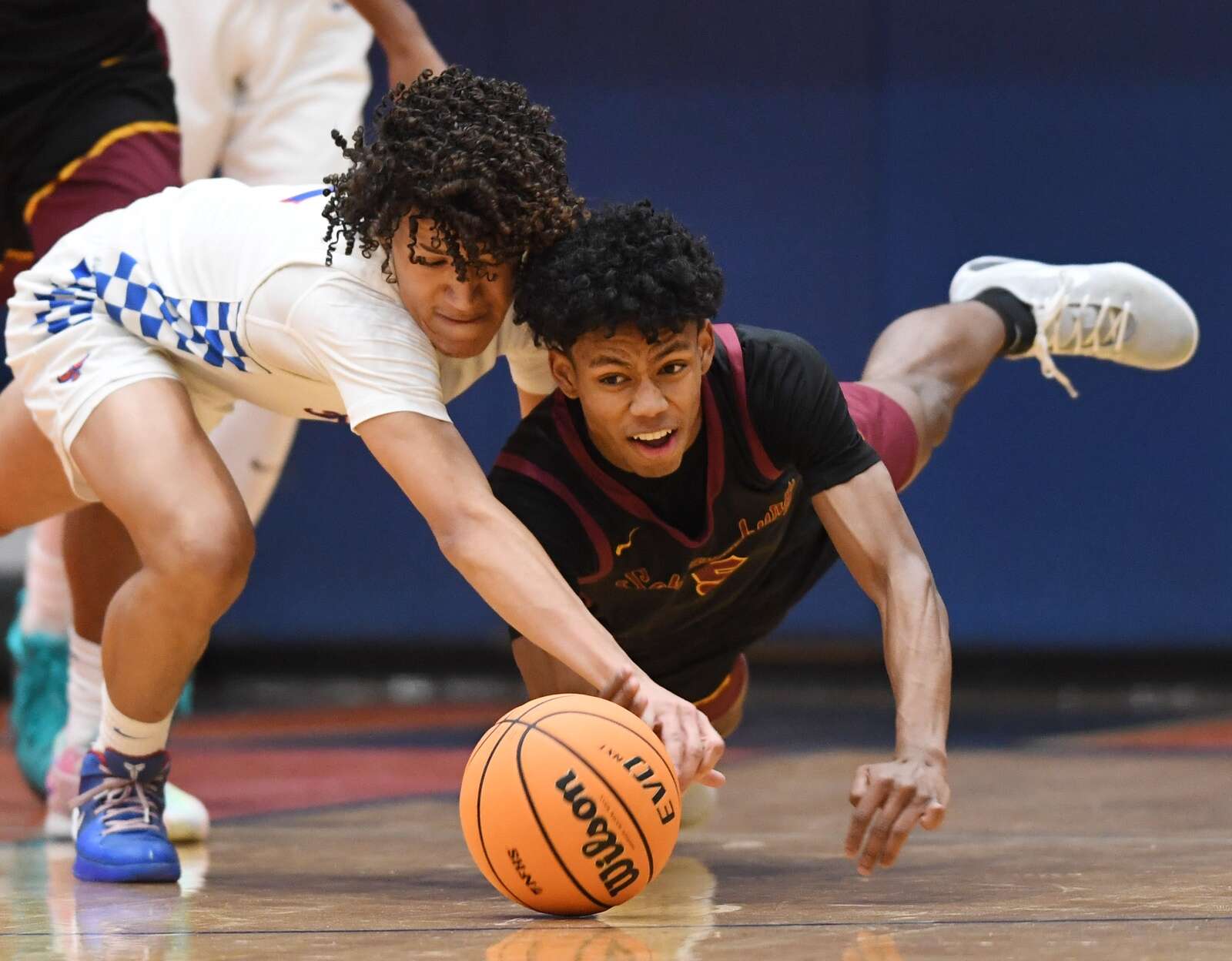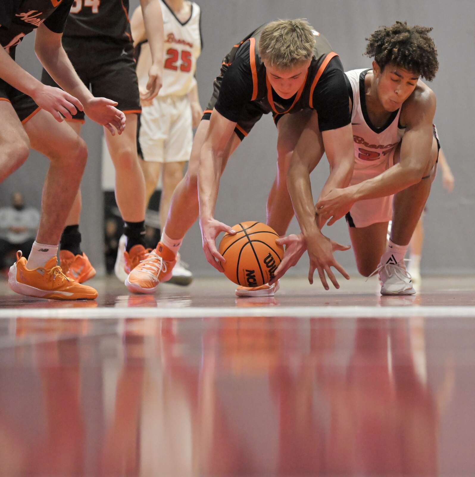Barrington’s D.J. Young, right, and Hersey’s Jake Nawrot reach for a loose ball in a boys basketball game in Barrington on Thursday, Jan. 8, 2026.