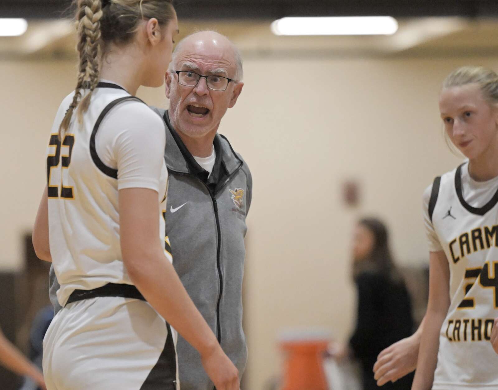 Carmel coach Benjamin Berg in a girls basketball game in Mundelein on Wednesday, Jan. 7, 2026.