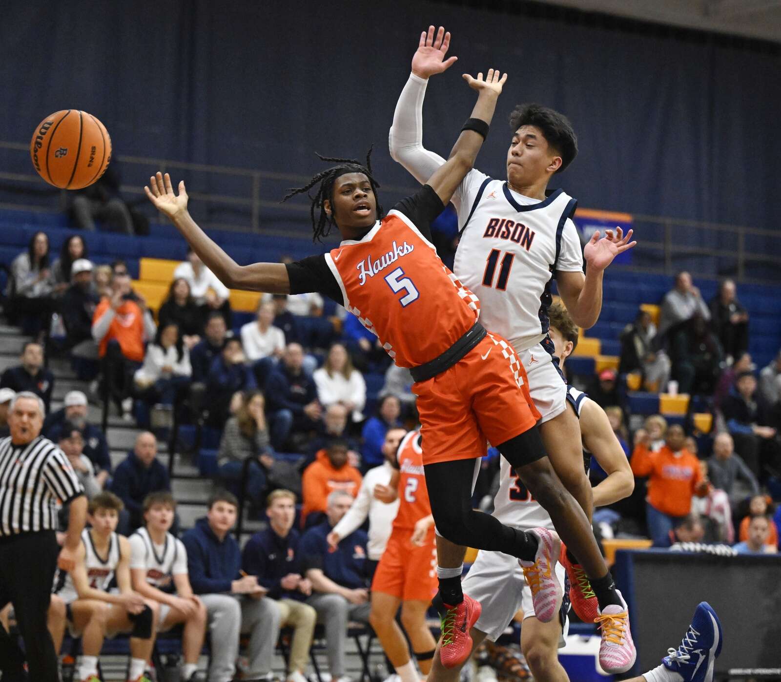 Hoffman Estates' Bryce Smith, right, blocks a shot by Buffalo Grove's Caleb Kim during Friday’s game in Buffalo Grove.