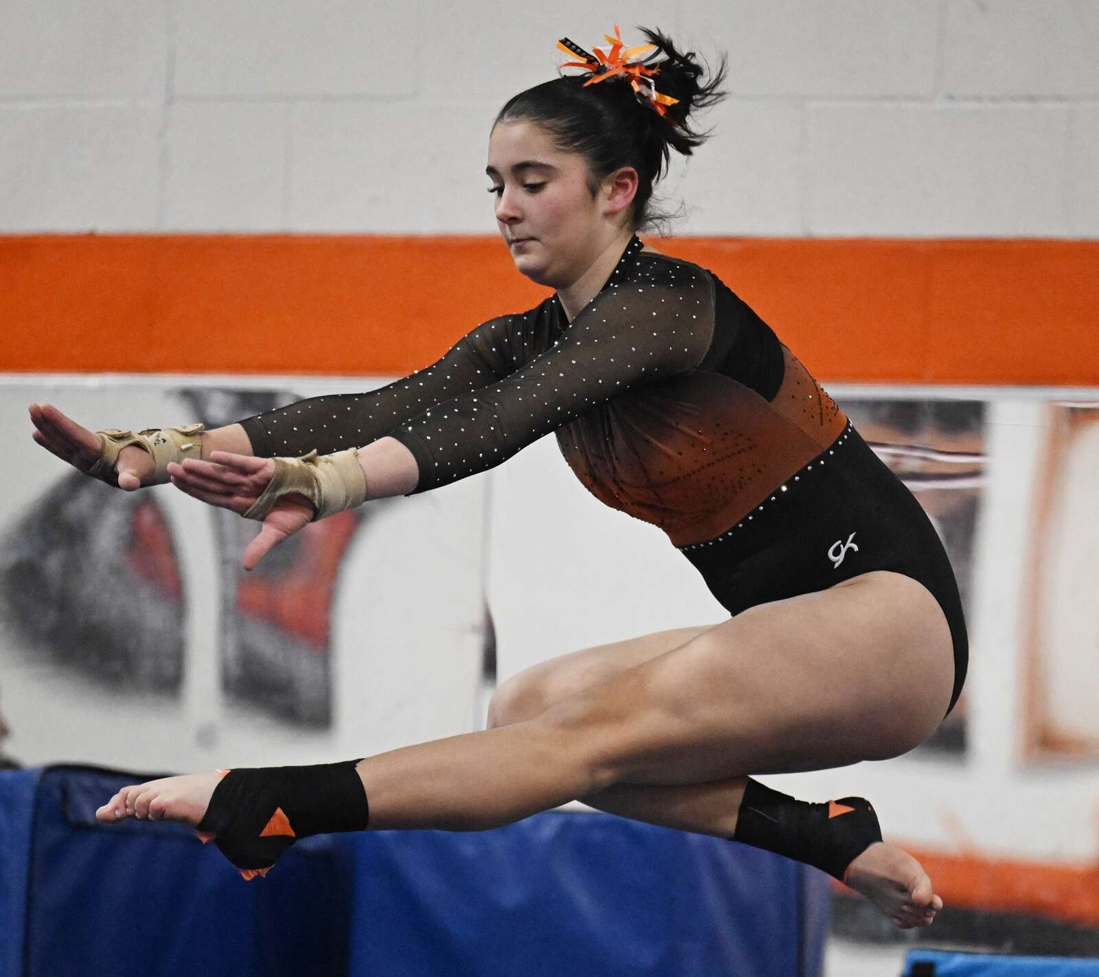 Libertyville’s Alex Kuehn competes on floor exercise during the North Suburban Conference girls gymnastics meet at Libertyville High School Thursday.