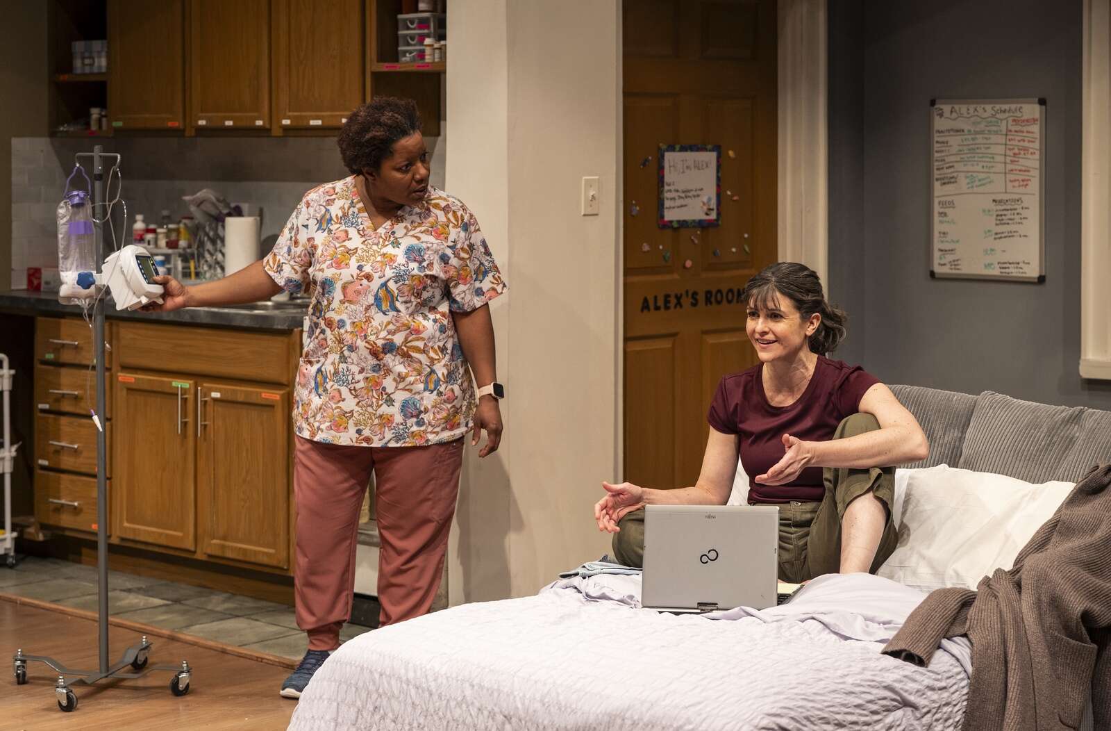 The first half of the intermissionless play unfolds in Mary Jane’s spartan, one-bedroom apartment in Queens, New York (the set is by A Inn Doo, Lonnae Hickman designed the properties). As befits a space where caregiving is the priority, the décor is utilitarian with pill bottles and nutritional supplements crowding the kitchen countertop. Bins, a plastic rolling cart and over-the-door organizers hold other medical supplies. In the second half, the action moves to the similarly nondescript hospital where Mary Jane and Alex spend weeks on end.