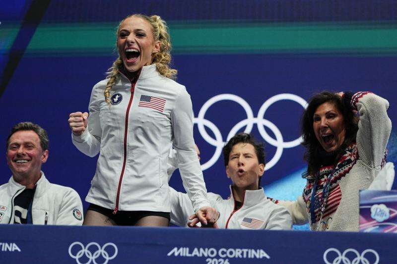 Emilea Zingas and Vadym Kolesnik of the United States react to their scores after competing during the rhythm dance in figure skating at the 2026 Winter Olympics, in Milan, Italy, Monday, Feb. 9, 2026. AP