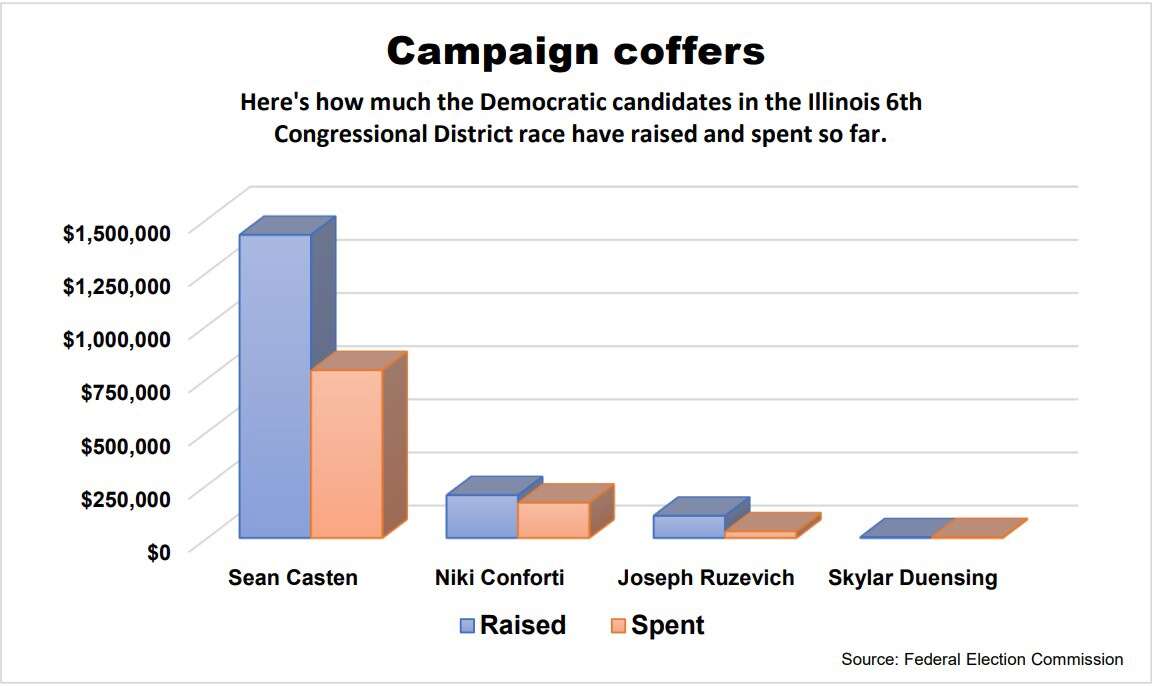 The Casten campaign started October with nearly $1.3 million in the bank. Of the $271,229 it reported receiving over the next three months, $166,357 came from individuals and $98,000 came from corporate political action committees, labor unions and other special interests.