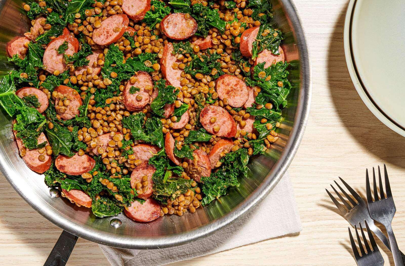 Skillet Turkey Kielbasa With Lentils and Kale