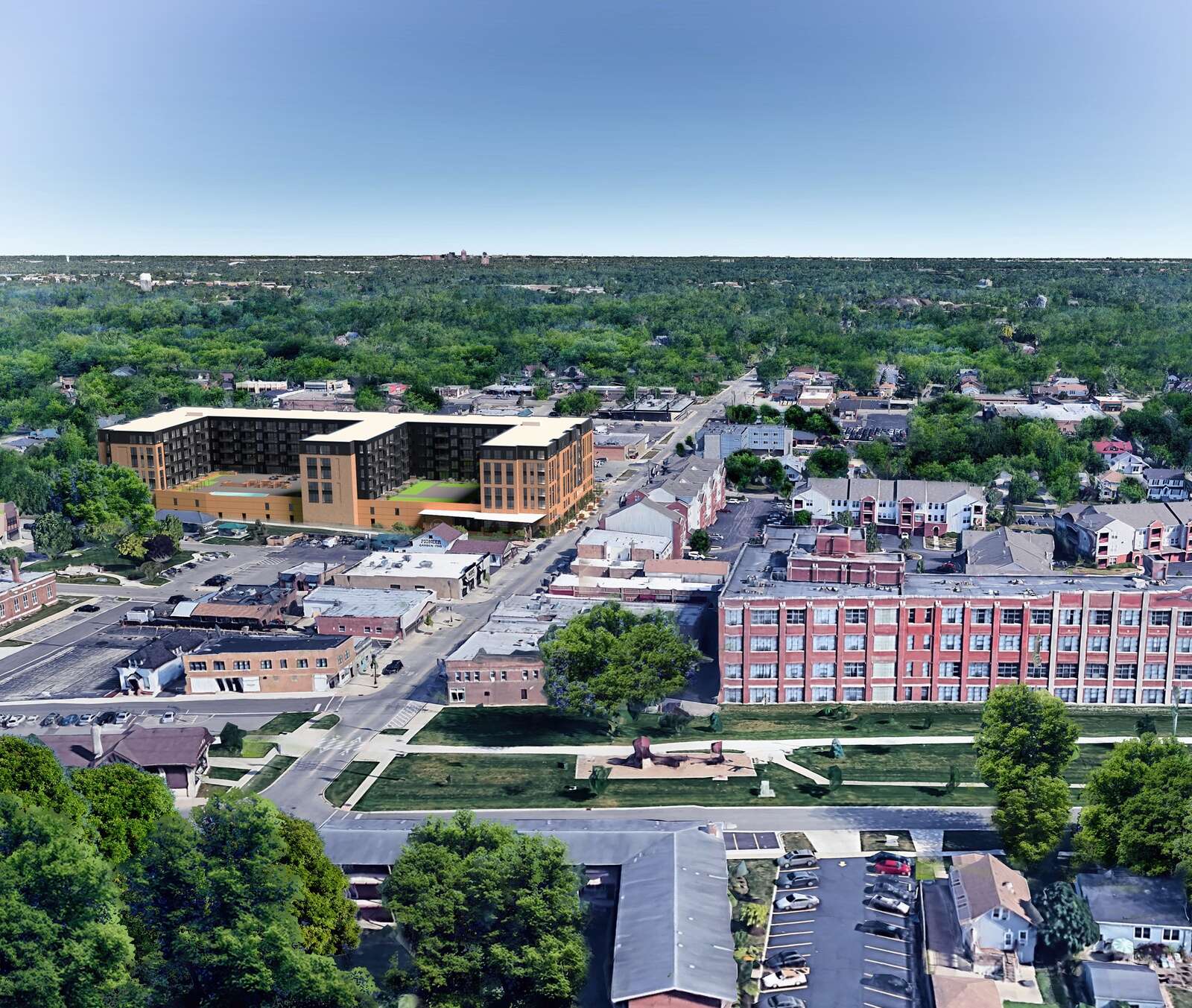 The seven-story building will become a new focal point in Villa Park’s business district years after the Ovaltine factory was redeveloped into apartments and the last of its smokestacks came down. Milwaukee-based Korb Architecture designed “The Union” with a brick exterior, metal accents and large windows.