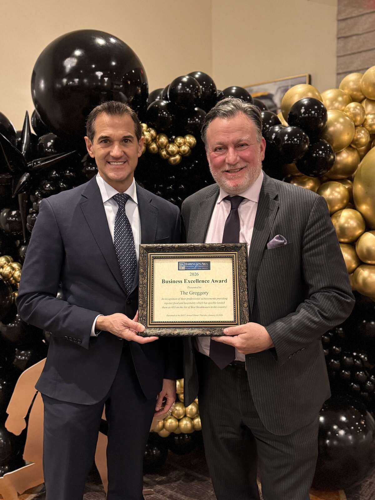 The Business Excellence Award was presented to The Greggory in recognition of its commitment to exceptional service and quality. Bill Veremis and Gregg Horan accept the award during the Barrington Area Chamber of Commerce's annual dinner celebration Jan. 29.
