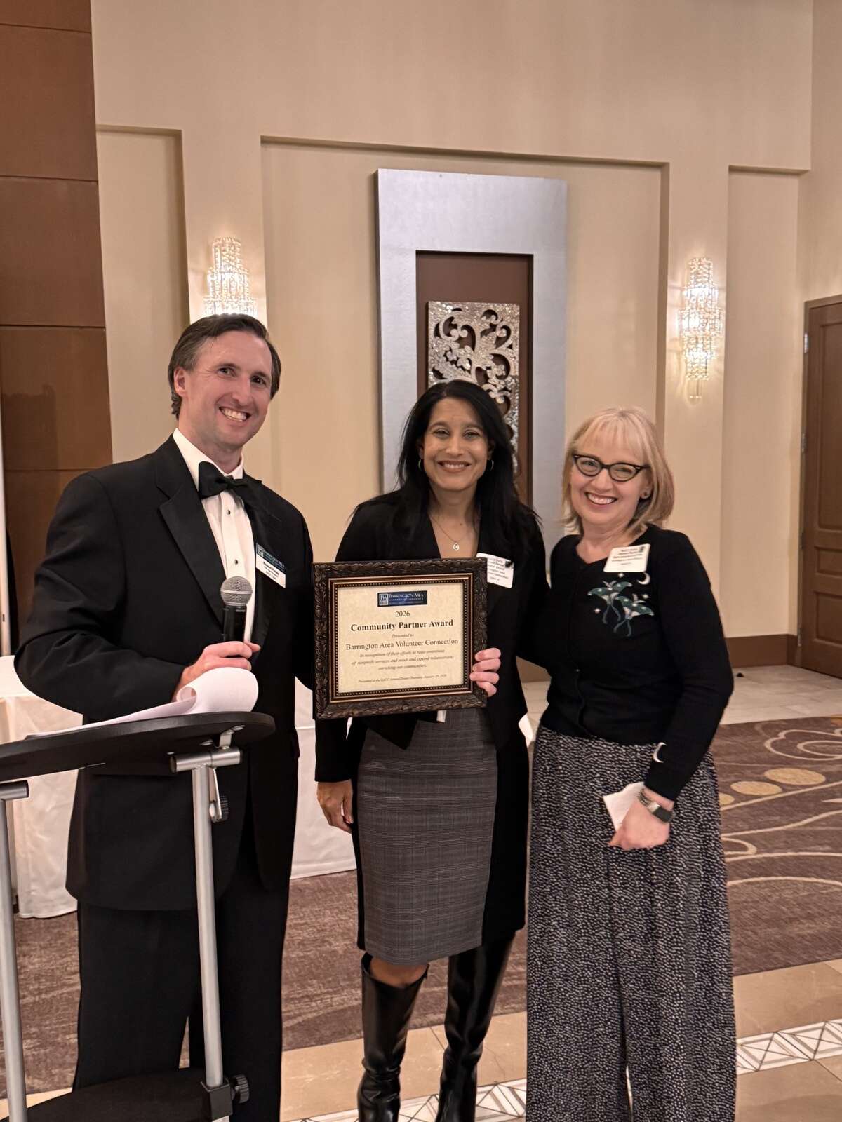 The Community Partner Award was presented to Barrington Area Volunteer Connection in recognition of its outstanding impact on the Barrington community. Shefali Bhuva and Sam Adams-Lanham accept the award during the Barrington Area Chamber of Commerce's annual dinner celebration Jan. 29