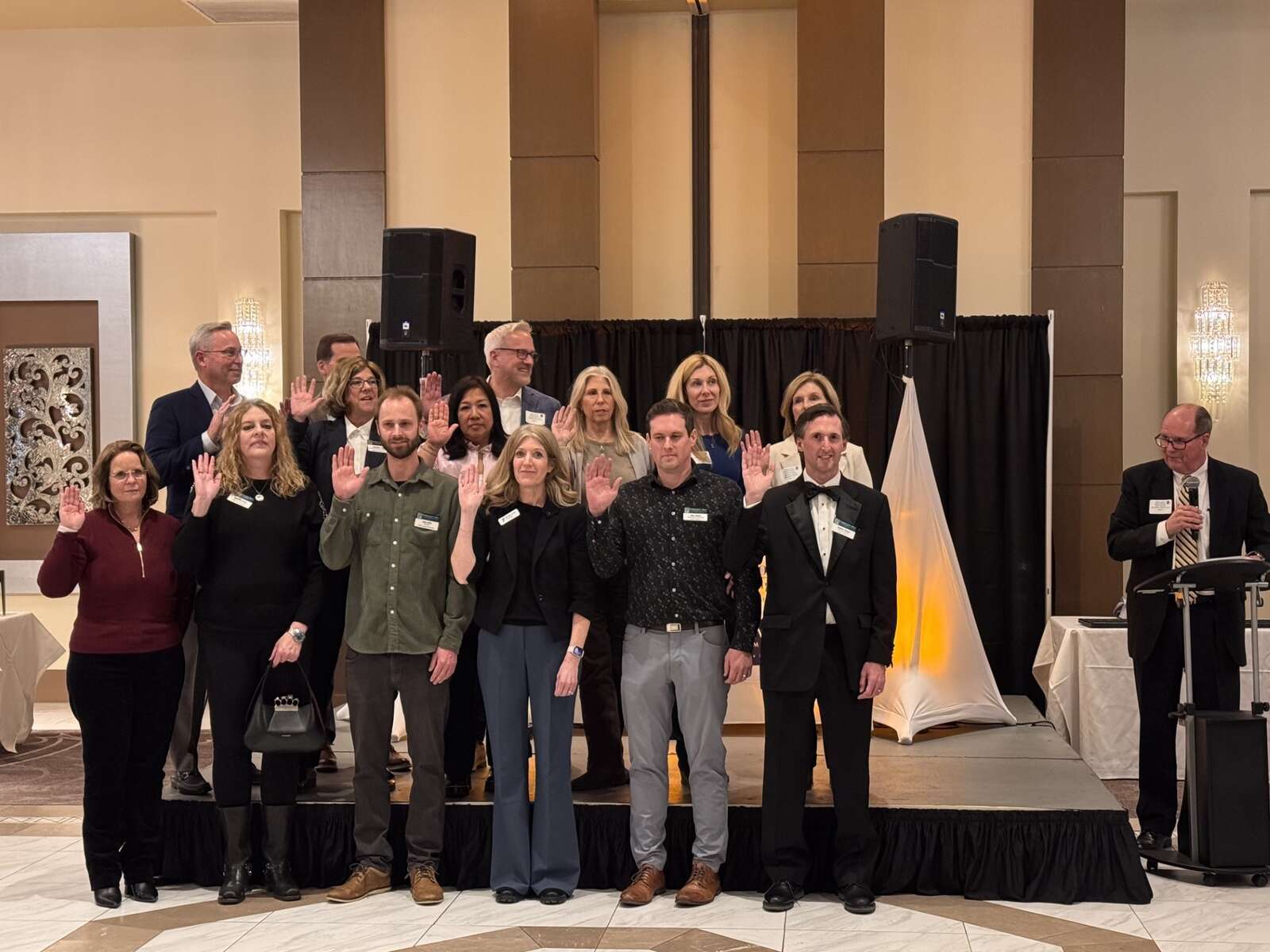 Barrington Area Chamber of Commerce board leadership is sworn in during the annual dinner celebration. Pictured from left are: Kyle Kick, John Christian, Jennifer Hissa, Dr. Craig Winkelman, Suzanne Corr, Zach Witt, Ellaine Sambo-Reyther, Scott Anderson, Jen Frey, Linda Gump, Rob Jones, Linda Fine, Julie Mayer, Robert Finley, and Brad Stetson, right, speaking at the microphone. Not pictured: Jon Stickney, Dr. Reinhold Llerena, Brett Koenig, Paul Maloney, Mike Dropka and Darice Trout.