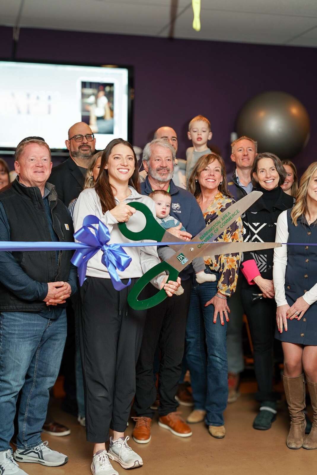Dr. Julie Roy prepares to cut the ribbon at Achieve Physical Therapy, alongside her uncle Matt Johlie, father Mike Johlie, husband Nick Roy, sons Riley and Casey Roy, mother Anne Johlie, Barrington Area Chamber of Commerce member Tim Matta, Tensile Strength Studio owner Jo Ann Graser, and many friends, family members, community leaders, and chamber members.