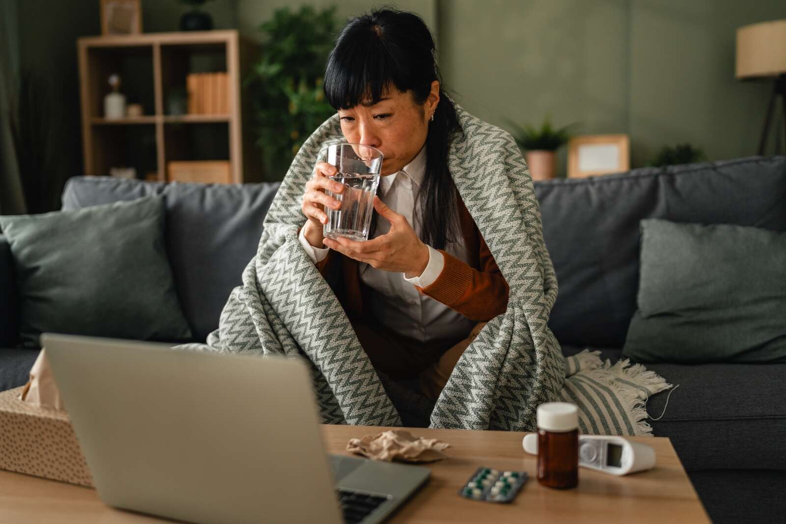 • Stay hydrated. Losing water and electrolytes through sweat when you have a fever, as well as through diarrhea and vomiting, can put you at risk for dehydration, so it’s important to drink plenty of water and make sure you’re getting enough electrolytes, Gulick said. Pediatric beverages and sports drinks with added sodium and potassium can help you stay hydrated, and warm liquids such as soups, broths and caffeine-free herbal teas can help ease symptoms such as congestion, body aches and chills, Sood said. Avoid alcohol and caffeinated drinks because they are diuretics and can make dehydration worse.