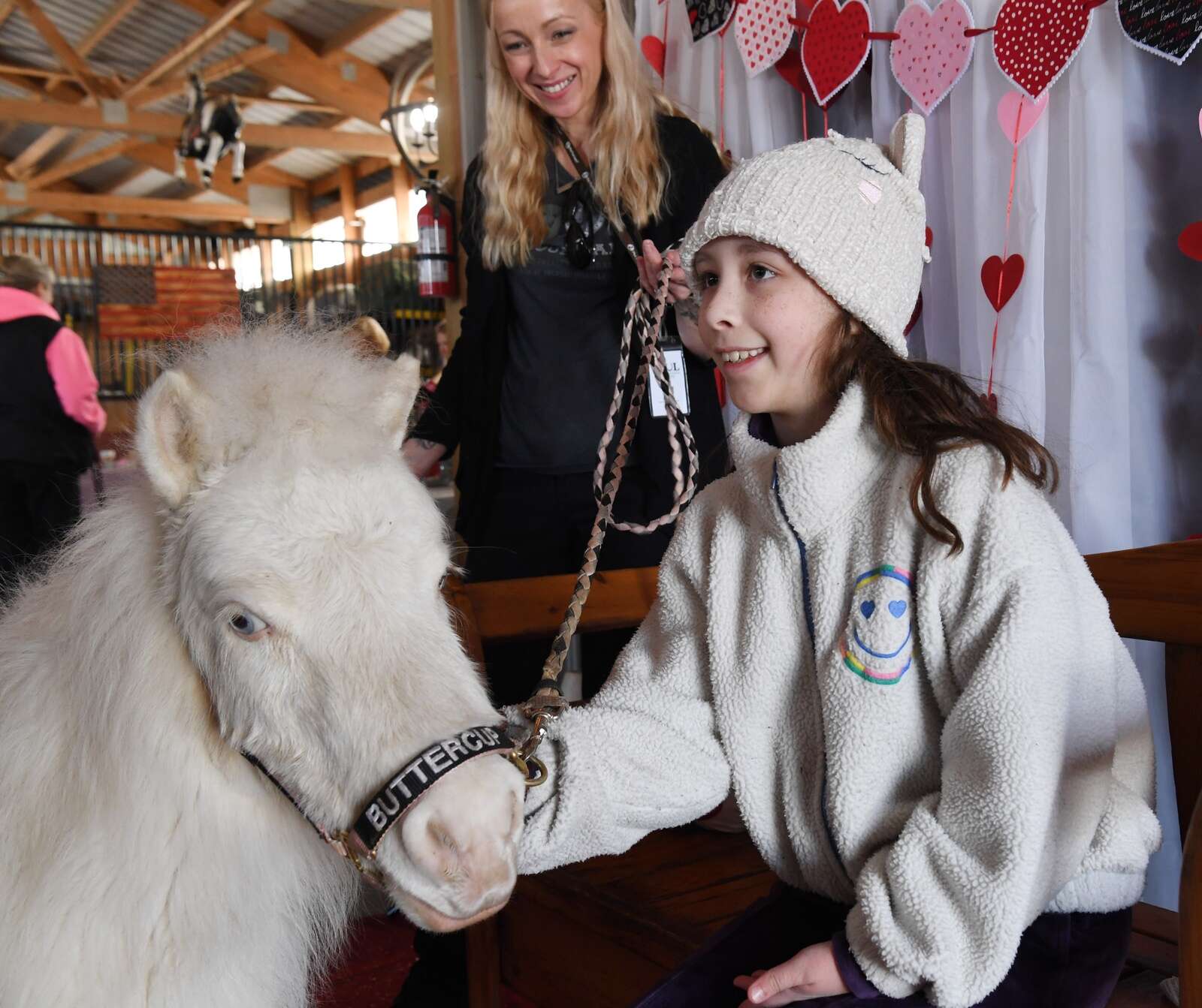 Penelope Cervenka, 9, of Hoffman Estates visits with “Buttercup” during the SOUL Kisses 4 Valentine's Day event Saturday at SOUL Harbour Ranch in Barrington. Buttercup, a miniature horse that stands 26 inches tall, was there with volunteer Amanda Marcin of Hoffman Estates. Joe Lewnard/jlewnard@dailyherald.com