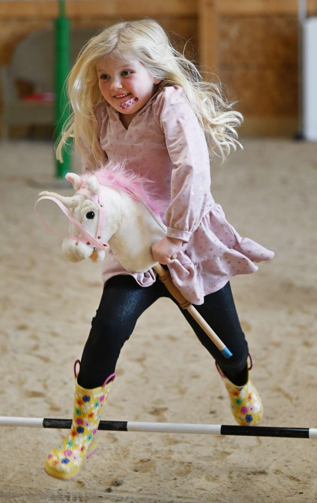 Hannah Bertram, 6, of Kenosha, Wisconsin, makes a jump with a hobby horse Saturday during the SOUL Kisses 4 Valentine's Day event at SOUL Harbour Ranch in Barrington. Her grandmother, who lives in Prospect Heights, is a volunteer at the ranch. Joe Lewnard/jlewnard@dailyherald.com