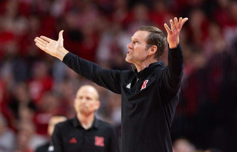 Nebraska head coach Fred Hoiberg disputes a referee's call as his team plays against Northwestern in the second half of an NCAA college basketball game Saturday, Feb. 14, 2026, in Lincoln, Neb. (AP Photo/Rebecca S. Gratz) (AP Photo/Rebecca S. Gratz)