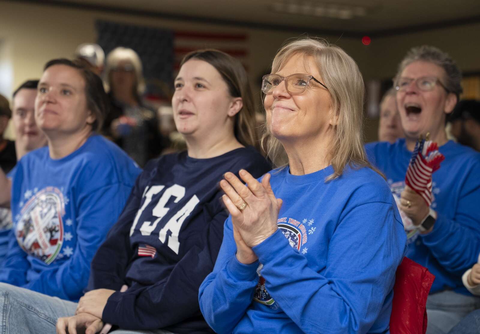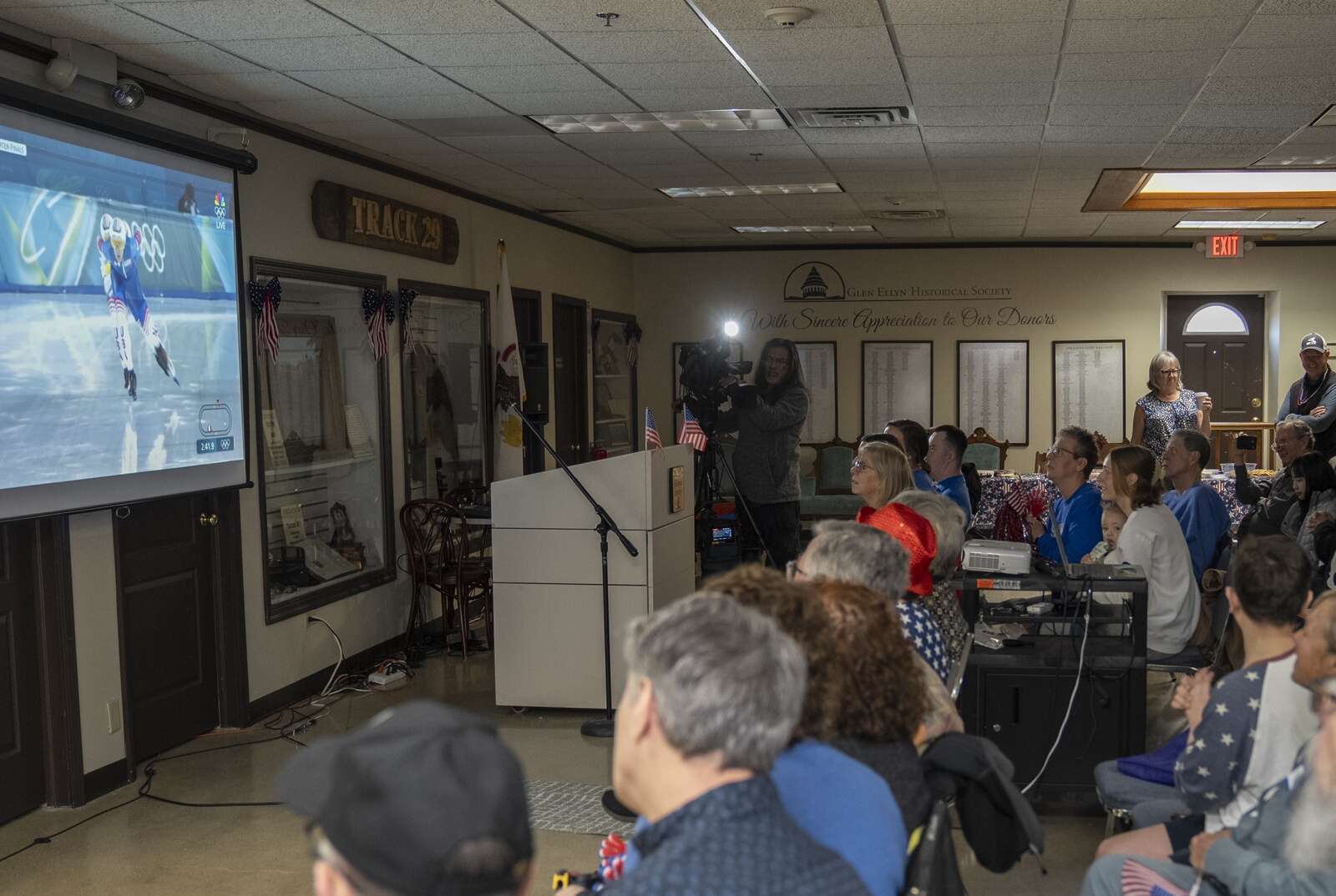 Supporters of suburban speedskaters Ethan Cepuran and Sarah Warren gathered at the Glen Ellyn History Center to watch them compete Sunday in the 2026 Milan Cortina Winter Olympics. Ryan Rayburn for the Daily Herald