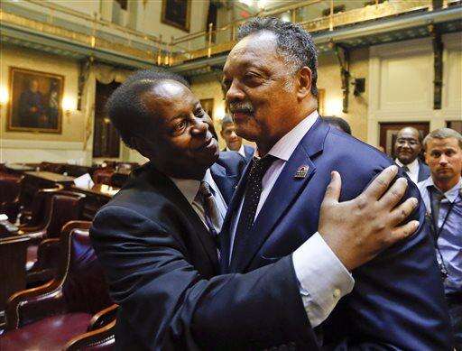 Rep. Carl Anderson, D-Georgetown, left, embraces Rev. Jesse Jackson after the House approved a bill removing the Confederate flag from the Capitol grounds early Thursday, July 9, 2015, in Columbia, S.C. The Associated Press