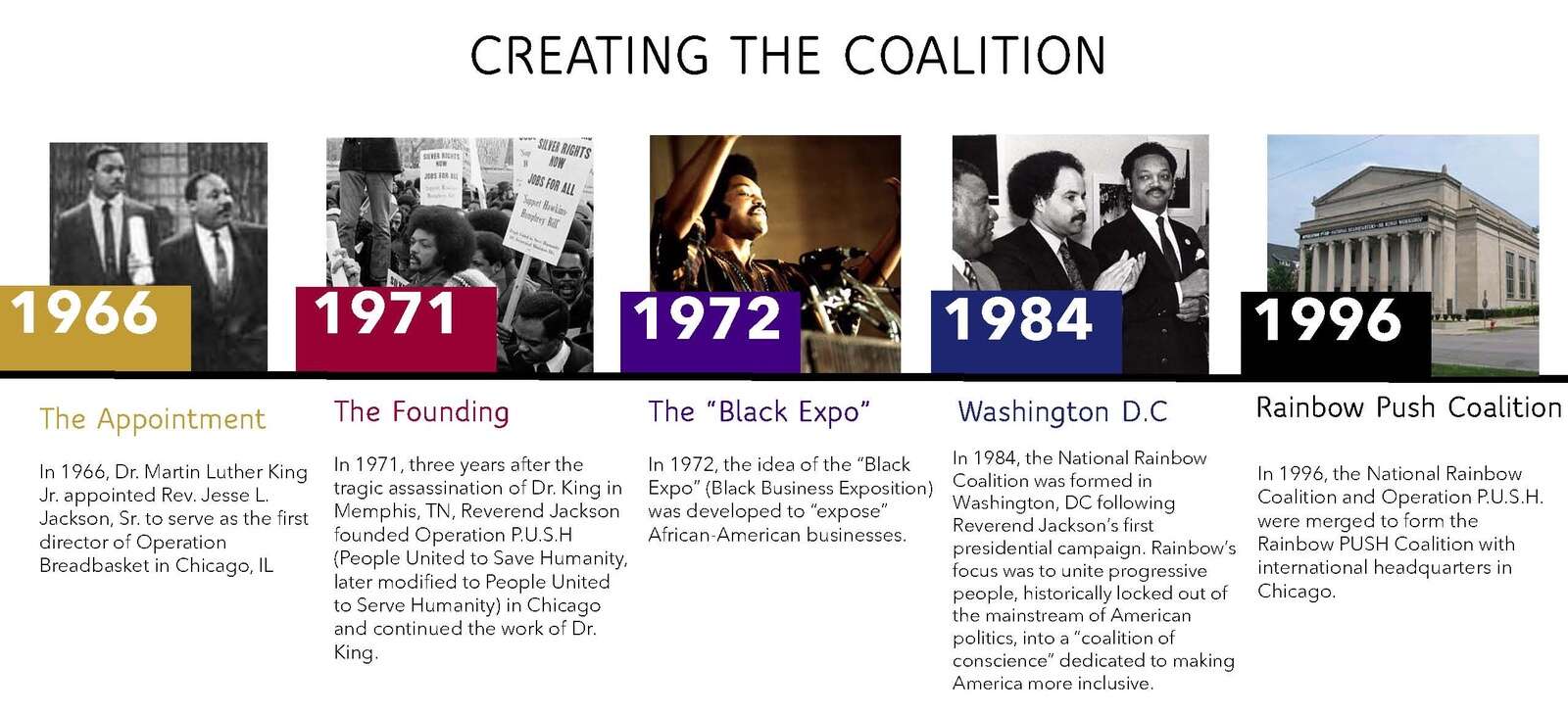 During the late 1960s and early 1970s, Jackson’s Operation Breadbasket and later Operation P.U.S.H (People United to Serve Humanity) served Chicago’s disadvantaged Black neighborhoods by distributing nutritious meals in food deserts and helping the unemployed find jobs and learn skills.