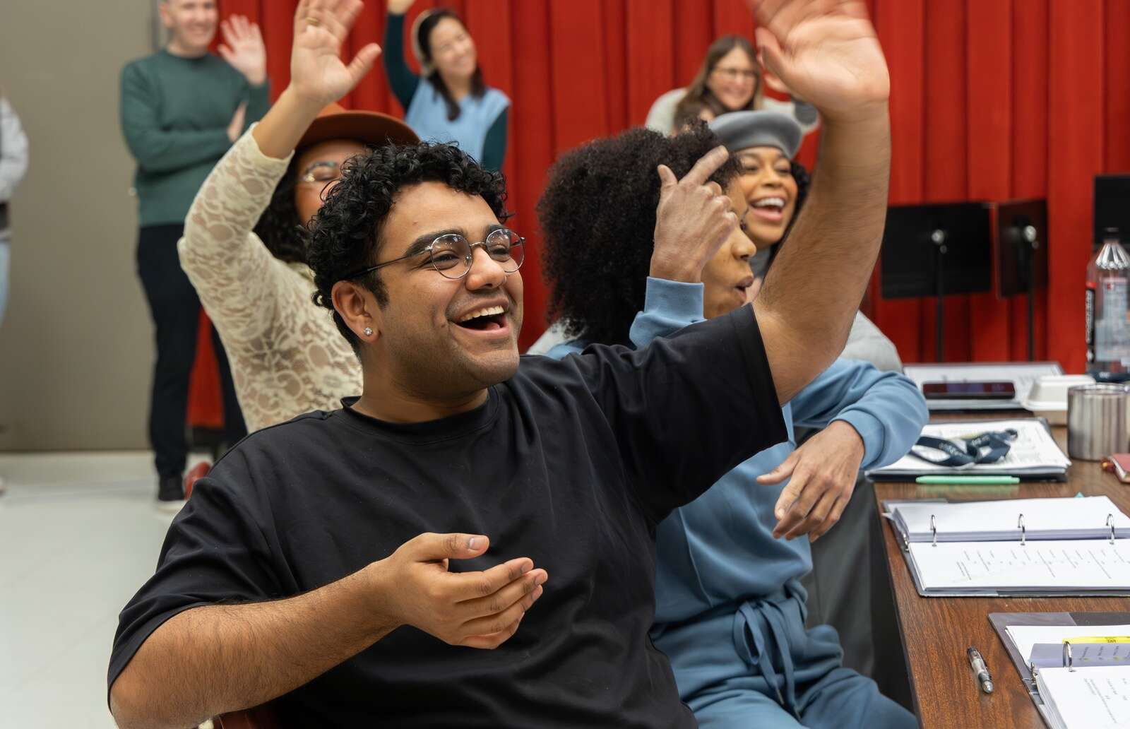 Lenin Izquierdo, center, seen here during a rehearsal, plays the titular character in Goodman Theatre’s premiere of the English adaptation of “The Brief Wondrous Life of Oscar Wao,” adapted from Junot Díaz’s Pulitzer Prize-winning novel by Marco Antonio Rodríguez. Courtesy of Hugo Hentoff