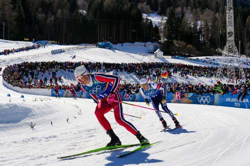Johannes Hoesflot Klaebo, of Norway, and Gus Schumacher, of the United States, right, compete in the cross-country skiing men's team sprint free at the 2026 Winter Olympics, in Tesero, Italy, Wednesday, Feb. 18, 2026. AP