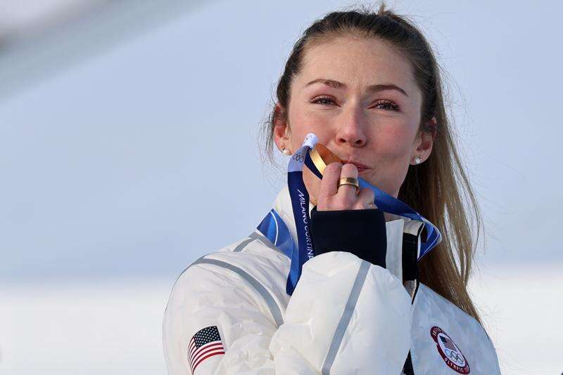 United States' Mikaela Shiffrin kisses the gold medal of the alpine ski, women's slalom race, at the 2026 Winter Olympics, in Cortina d'Ampezzo, Italy, Wednesday, Feb. 18, 2026. AP