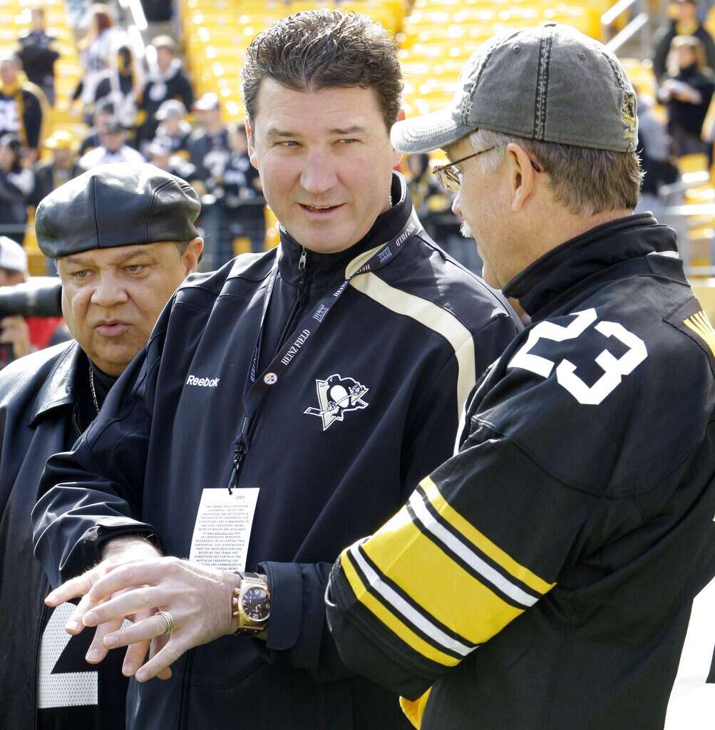 In a picture from 2009, retired Pittsburgh Steelers safety Mike Wagner, right, visits with NHL hockey Hall of Famer Mario Lemieux, the owner of the Pittsburgh Penguins, on the sidelines at Heinz Field before an NFL game between the Pittsburgh Steelers and Cleveland Browns. AP