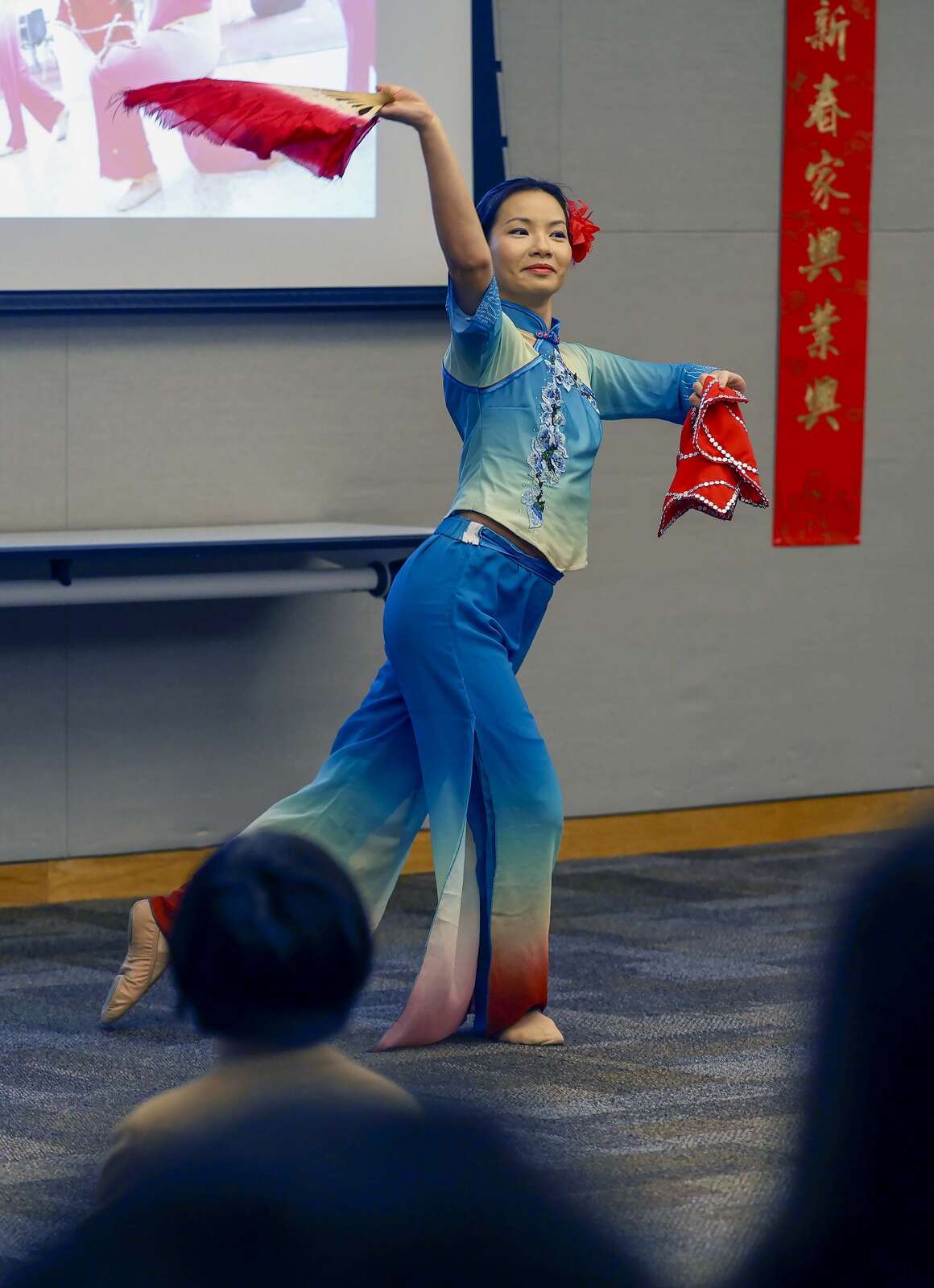 Angela Tam, founding artistic director of Yin He Dance, performed a Han Folk Dance for the group before teaching children a Yunnan Flower Lantern Dance.