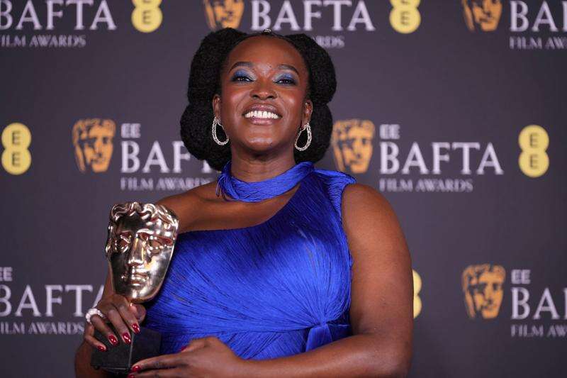 Wunmi Mosaku poses with the award for supporting actress for 'Sinners' at the 79th British Academy Film Awards, BAFTA's, in London, Sunday, Feb. 22, 2026. (AP Photo/Alastair Grant) (AP Photo/Alastair Grant)