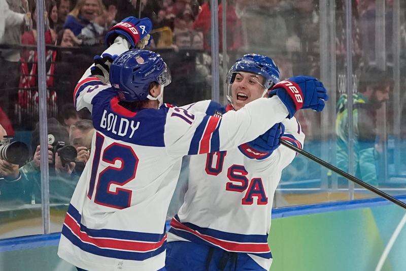 United States' Matt Boldy, left, celebrates after scoring the opening goal during a men's ice hockey gold medal game between Canada and the United States at the 2026 Winter Olympics, in Milan, Italy, Sunday, Feb. 22, 2026.