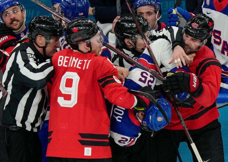 Referees try to break up a fight between Canada's Sam Bennett (9), United States' Charlie McAvoy (25) and Canada's Tom Wilson (43) during the second period of the men's ice hockey gold medal game at the 2026 Winter Olympics, in Milan, Italy, Sunday, Feb. 22, 2026.