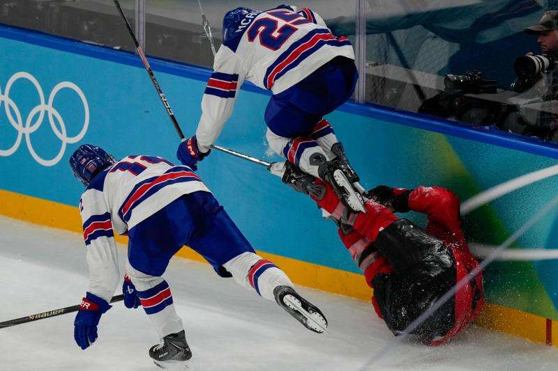 United States' Charlie McAvoy (25) leaps over Canada's Tom Wilson (43) during the second period of the men's ice hockey gold medal game at the 2026 Winter Olympics, in Milan, Italy, Sunday, Feb. 22, 2026.