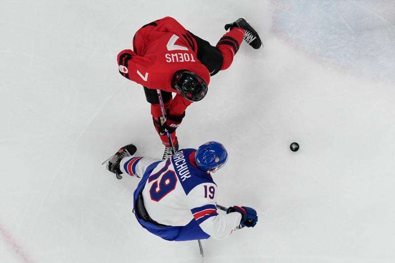 Canada's Devon Toews (7) challenges with United States' Zach Werenski (8) during a men's ice hockey gold medal game between Canada and the United States at the 2026 Winter Olympics, in Milan, Italy, Sunday, Feb. 22, 2026.